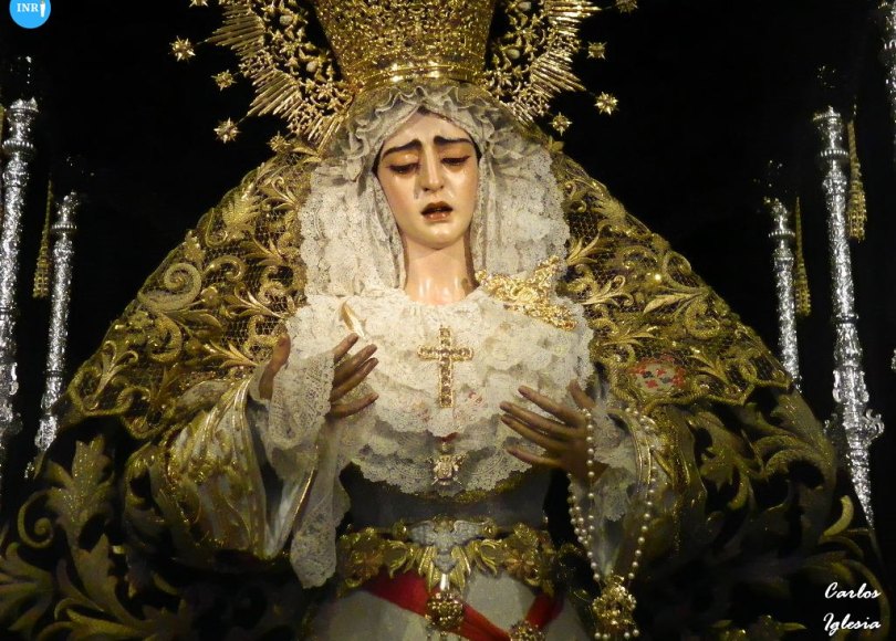 La imagen lucía su manto de salida de terciopelo burdeos, saya blanca y toca de sobremanto. A los lados, las diferentes jarras de flores, dando así mayor solemnidad,