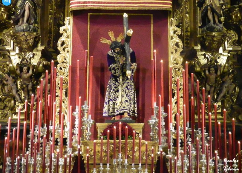 El Señor de Pasión se encuentra sobre una peana dorada y luce la túnica bordada de los cuernos de la abundancia del taller de Manuel Ariza. En esta ocasión, porta la cruz y lleva un juego de potencias.