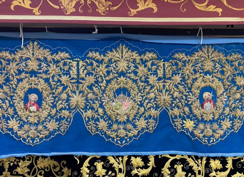 Además, durante la intervención el taller constató que las caídas carecían de ojal y en su día se realizaron una aberturas ya que en el diseño original no se contemplaron. Una vez concluido el pasado del reverso de las piezas, se pasará a la reposición de la pasamanería, la cual se ha de colocar chorro a chorro y uno por uno, y se finalizará con el encare y sujeción a la nueva crestería.