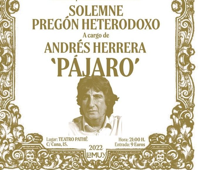 La cita, el próximo jueves 7 de abril, a las 21.00 horas, en el teatro Pathé se Sevilla. Sobre sus tablas se celebrará el Pregón Heterodoxo que, organizado por la revista La Muy, regresa en su cuarta edición tras dos años en blanco a causa de la pandemia.