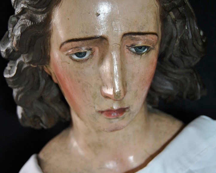 La imagen presenta un tamaño natural, en posición arrodillada, tiene el gesto de portar en sus manos el cáliz. Tiene dos alas doradas no originales y se asienta sobre una base. Apenas se tienen documentos de esta talla, por lo que se espera que con estas tareas se pueda obtener la mayor información posible.