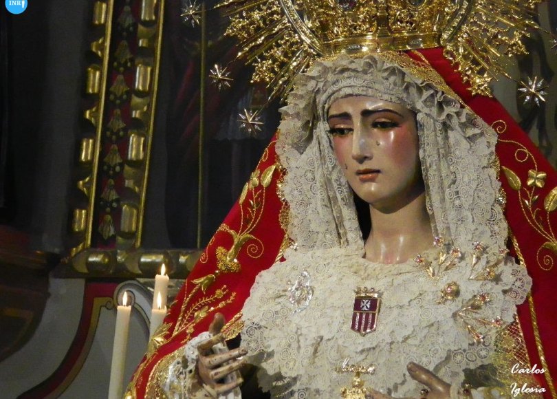 La dolorosa de Paz Vélez iba vestida para la ocasión con su nuevo manto de terciopelo rojo bordado, saya blanca. Tras la imagen, se podía contemplar elpaso de palio con el sillón de la Realeza de María. Flores de diversas especies en tonalidad blanca.