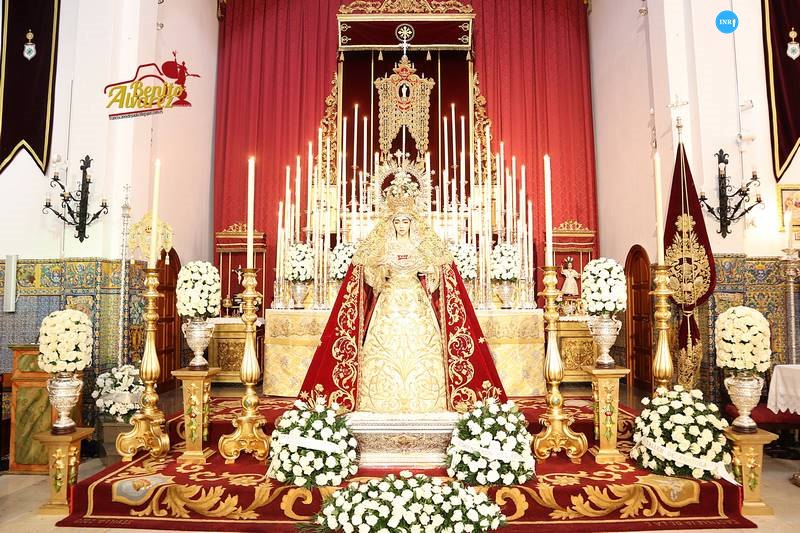 La dolorosa lució su manto de salida y saya blanca bordada bordada para la ocasión. Estuvo escoltada por dos candelabros y con un exorno de distintas especies florales.