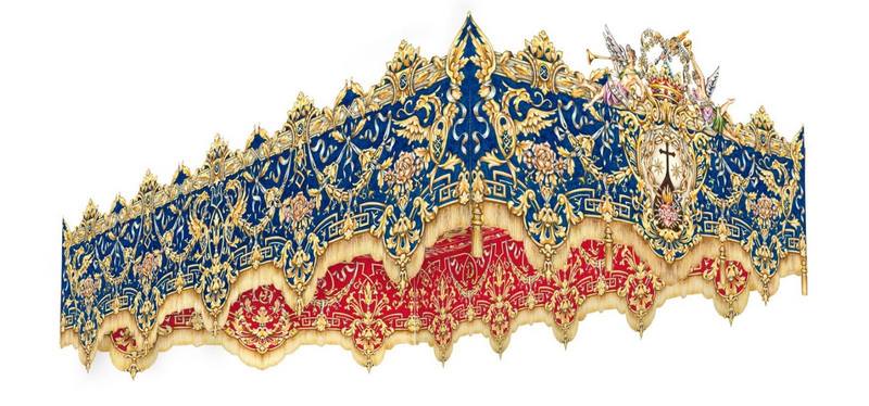 En este diseño se puede contemplar el juego completo de bambalinas, techo de palio, así como faldones bordados integrando la orfebrería del respiradero con la intención de proponer un proyecto armónico, junto con la saya a juego del manto.