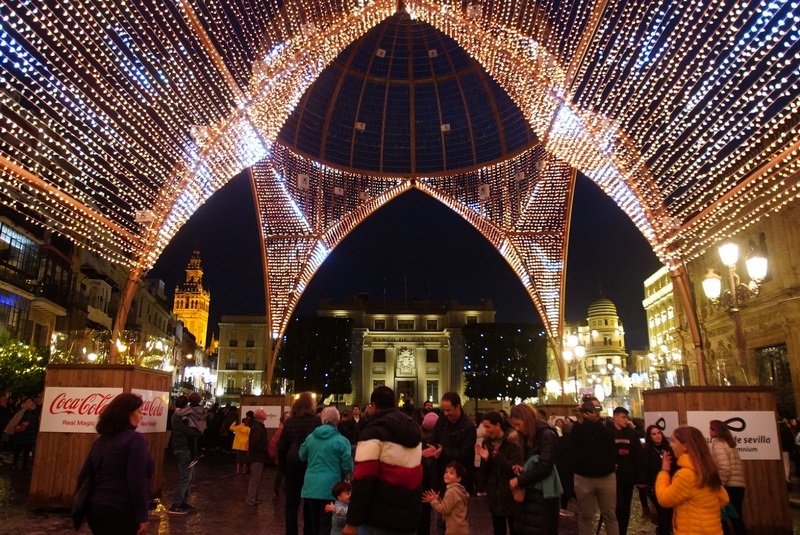 Sevilla luce de gala, de traje largo y luz alta. Sevilla se viste de Navidad ya en vísperas de otro alumbramiento, el que le da sentido a la propia luz.