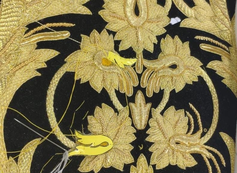 Se trata de una saya simétrica compuesta por hojas de acanto, roleos, flores y guirnaldas que estarán bordadas en oro sobre terciopelo negro. En su forro cobijará los nombres de los hermanos.