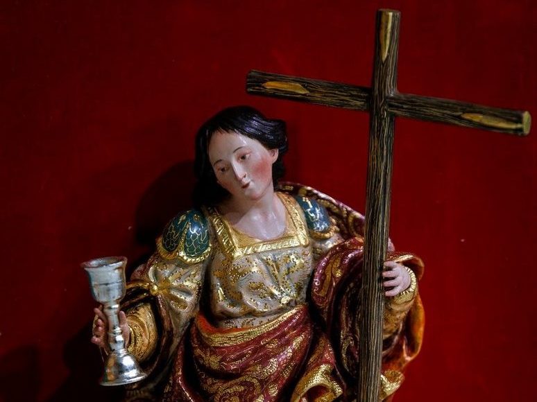 La virtud teologal de la Fe se representa portando en su mano derecha un cáliz, realizado en madera torneada y dorada en oro blanco, y sujetando en su mano izquierda la Santa Cruz, también realizada en madera de cedro dorada con oro de 24 quilates y posteriormente estofada al temple de huevo.