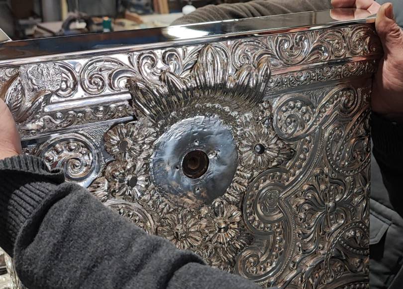 Igualmente se repasará la parte inferior del mismo ya que presenta numerosos filos cortantes, el sustento de los elementos de los paños de plata que, en la actualidad se realiza con puntillas de plata y pasarán a tener un nuevo sistema de pernos que darán una consistencia y seguridad mayor a la pieza.