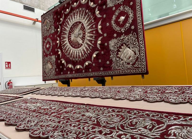 En el caso del techo de palio se ha hechouna limpieza superficial con microaspiración, eliminación de adhesivos y óleos, limpieza de bordados una consolidación puntual y una reintegración en los casos que se determine.
