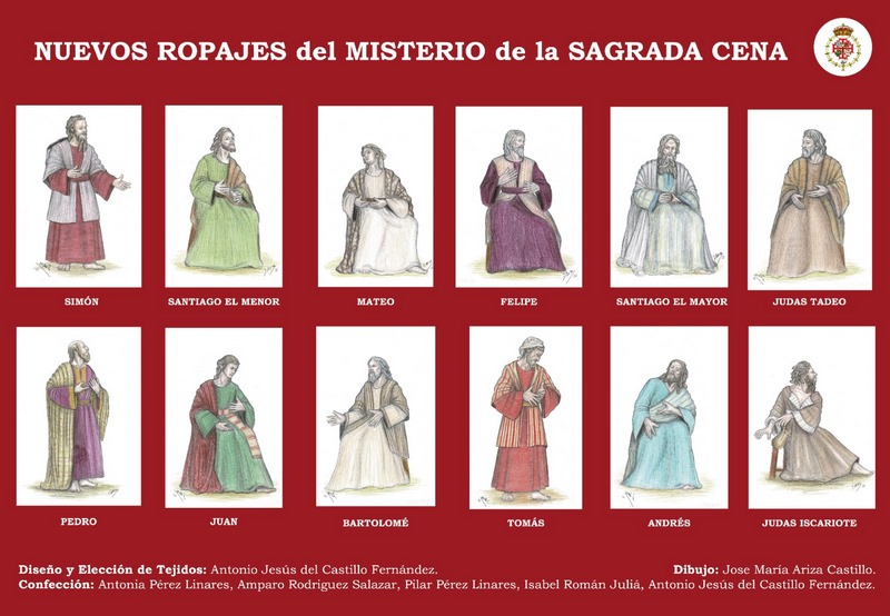 Tomás contará con túnica de tejido de chenilla color rojo y casaca de mangas cortas en tejido de chenilla colores verde oliva, rojo y marfil. Andrés estará con túnica de tejido de chenilla color azul turquesa con forro de seda salvaje color ocre y mantolín de tejido de chenilla de rayas color ocre, turquesa y marfil. Para finalizar, Judas Iscariote llevará puesto túnica de pana aterciopelada color visón con forro de loneta color marfil con rayas color beige, visón y azul.