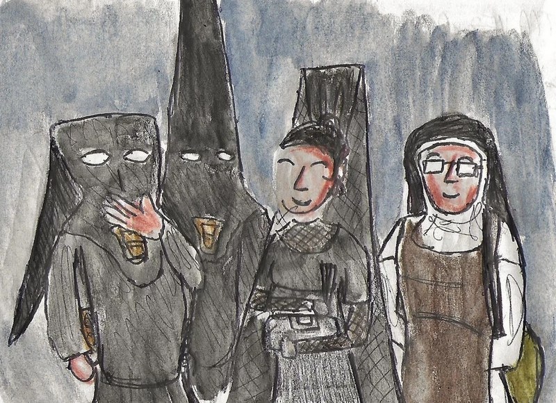 La tarde del Jueves Santo llegué a la plaza Cristo de Burgos buscando un lugar para merendar de forma contundente en previsión de la Madrugá que se aproximaba, y pude ver una escena con una nazarena, una penitente, una mujer de mantilla y una monja, aunque esta última no participaba en la conversación a susurros de las otras tres, simplemente pasaba por allí.