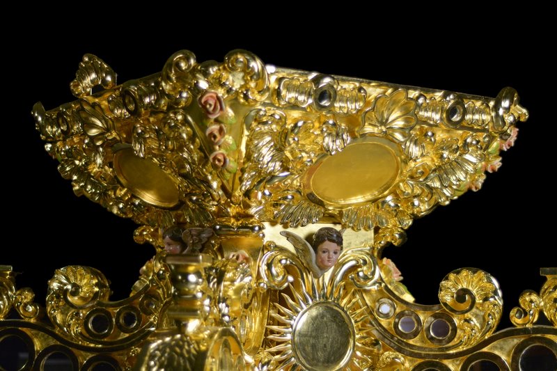 Desde la parte central de los brazos aparecen guirnaldas de rosas que unen los brazos, donde aparecerán elementos muy característicos del barrio de La Huerta del Carmen (cerezas, avellanas y manzanas en honor a las calles aledañas de la parroquia y por donde discurre la procesión de la Virgen).