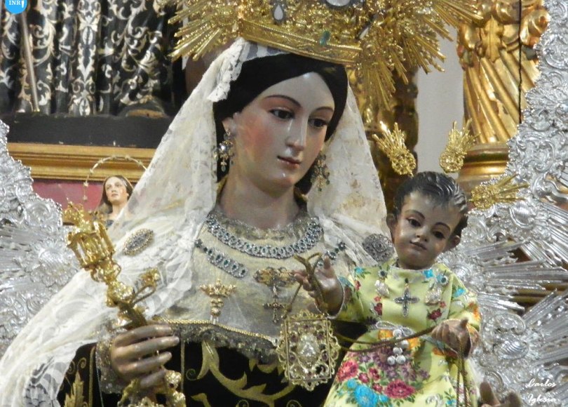 La Virgen del Carmen de San Leandro estuvo expuesta en besamanos en el fin de semana de su festividad. En el presbiterio de su parroquia del barrio, estaba la imagen de manera más cercana a los fieles, que vestía manto blanco y saya bordada marrón. Flores de tonalidad blanca, diferentes hacheros y candelabros de cera blanca y un dosel componen la escena.