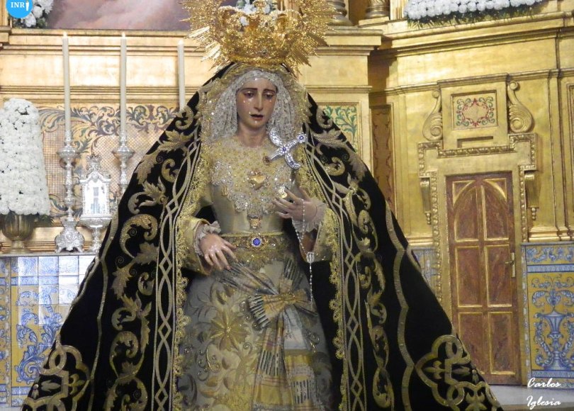 La dolorosa de Paz Vélez iba vestida para la ocasión con su nuevo manto de terciopelo granate bordado, saya blanca y toca de sobremanto. Tras la imagen, se podía contemplar el sillón de la Realeza de María bajo dosel y flores de diversas especies en tonalidad blanca.