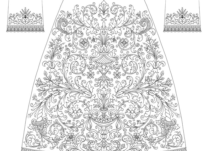 Llama la atención la profusa ornamentación de toda la obra, sin dejar ningún espacio liso, cubriendo toda la superficie de la saya, la cotilla y las mangas, destacando diferentes motivos decorativos típicos de la producción antes citada, como hojas entrelazadas, macetillas, centros, cuernos de la abundancia, lazadas, guirnaldas y multitud de motivos florales de diferentes tipos.