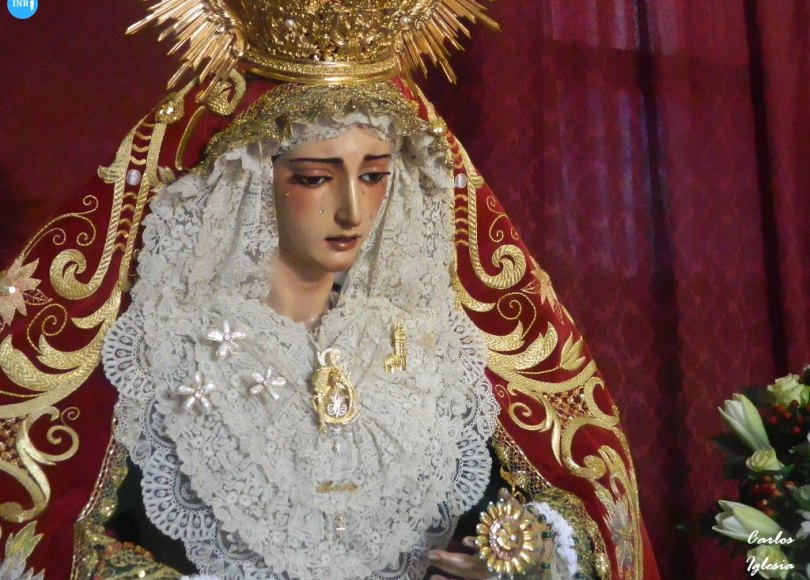 Desde Ciudad Jardín, la Virgen del Rosario de la Milagrosa se encontraba expuesta en su tradicional besamanos. La dolorosa llevaba un manto de terciopelo rojo bordado y estrenaba saya torera.