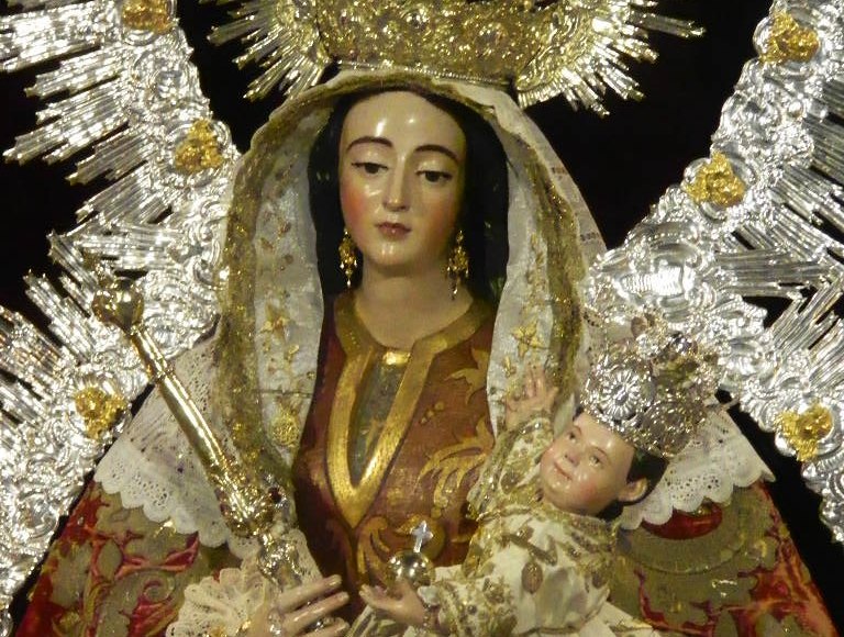 En esta ocasión, tiene la particularidad de haberlo en la parte trasera el templo, en la altura del trascoro. Bajo dosel lució su manto rojo en terciopelo bordado, mientras que el Infante llevó corona y túnica blamca bordada a juego. Flores en tonalidad roja y candeleros de cera blanca completaron el conjunto.