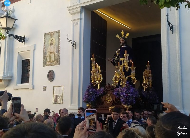 A las 16.10 horas se abrían las puertas de Santiago para la salida del cortejo. En su interior tocó un quinteto de metales de la Agrupación Musical de la Redención. Pocos minutos después salía el Señor de la Redención bajo del sol de esa tarde de febrero con el acompañamiento de la capilla y la escolanía de María Auxiliadora. Las andas las portaba miembros de la Hermandad Matriz de Almonte.