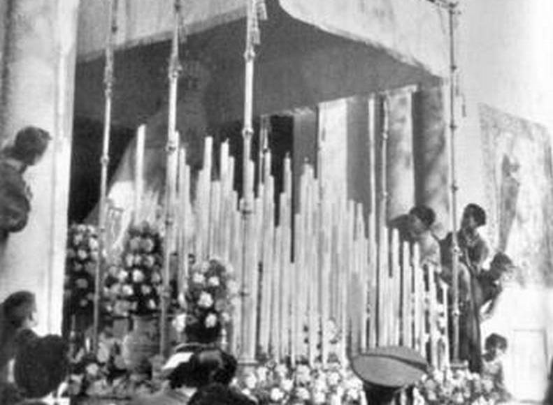 Apreciamos en la fotografía la primera salida procesional de la dolorosa de San Gonzalo. Hermandades como La O o La Estrella hicieron posible este acontecimiento gracias a los enseres que prestaron para poder realizar la estación de penitencia de la cofradía del Barrio León.