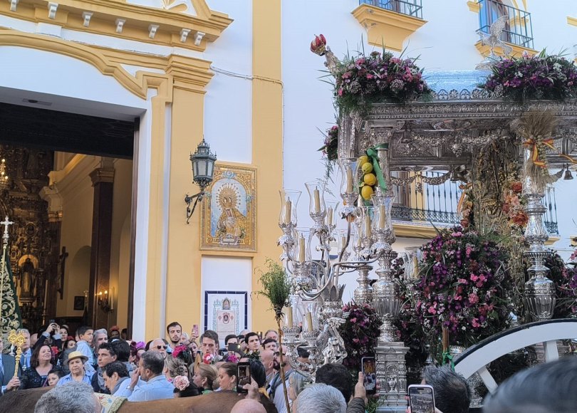 Poco antes de las 08.30 horas salió de nuevo para ser subido a su carreta que estaba situada en la calle Pagés del Corro. Además una banda interpretó pasodobles desde su salida. Transitó por San Jacinto, Santa, Pureza y Castilla, donde saludó tanto a las corporaciones de la Esperanza de Triana, O y el Cachorro, antes de tomar el camino hacia la aldea almonteña.