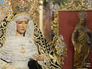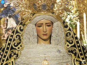 La Virgen de los Dolores del Cerro estuvo en el presbiterio de su altar. La dolorosa llevó su manto de salida y saya de terciopelo granate bordada y fajín. Flores en tonalidad blanca en jarrones y centros. Completó el conjunto un dosel de culto y de fondo, una tela de damasco.