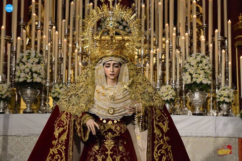 La Virgen del Rosario de la Hermandad de San Pablo estuvo expuesta en besamanos en este tercer fin de semana de octubre. La imagen lució manto burdeos y saya blanca bordada para la ocasión. Estuvo flanqueada por dos ángeles ceriferarios y tras Ella, un dosel.