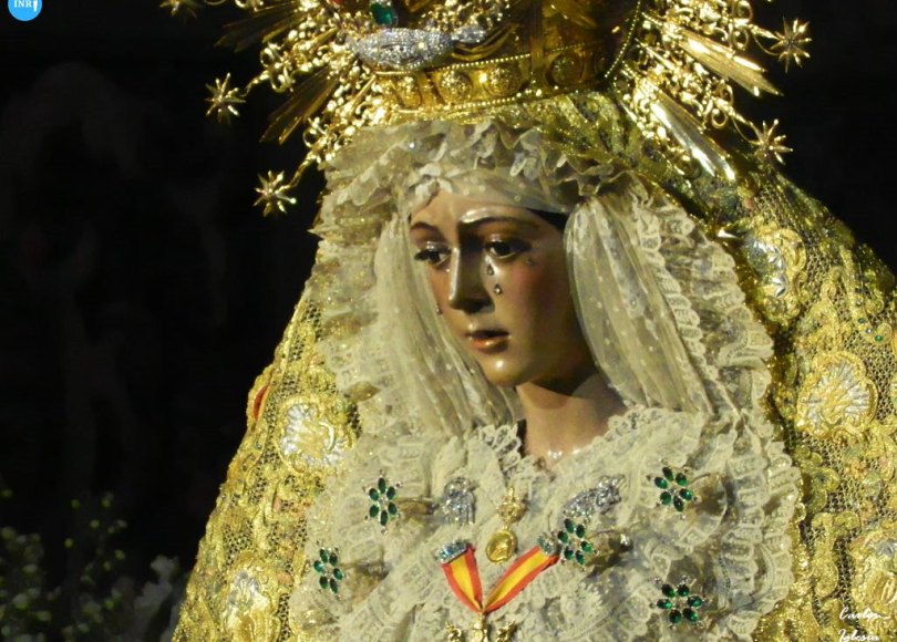 Para la ocasión, luce el manto de malla o ‘camaronero’, diseñado y realizado por Juan Manuel Rodríguez Ojeda en el año 1900. La saya está bordada en terciopelo burdeos y ejecutada por Guillermo Carrasquilla en 1962, con piezas del antiguo palio de Rodríguez Ojeda de 1908 y de Victoria Caro de 1940. Estrena la toca de ‘Juanita Reina’, recuperada por el taller de Francisco Carrera Iglesias ‘Paquili’. A su izquierda se dispone en un pedestal la Rosa de Oro.