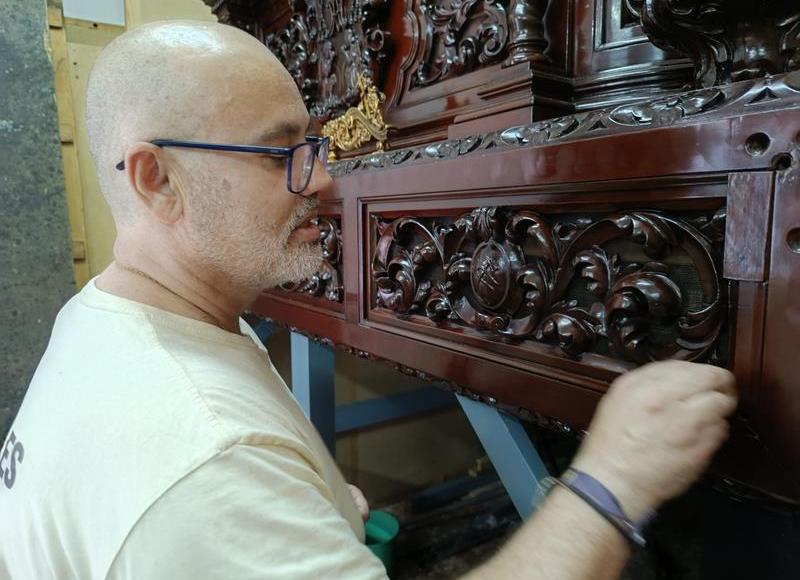 Un paso en caoba, que fuera restaurado en 1996, y que desde entonces recibe un tratamiento de conservación año tras año y así continuará, ahora en las manos de este reconocido charolista sevillano que tiene en su haber la reciente restauración del paso de misterio de la Hermandad de la Milagrosa.