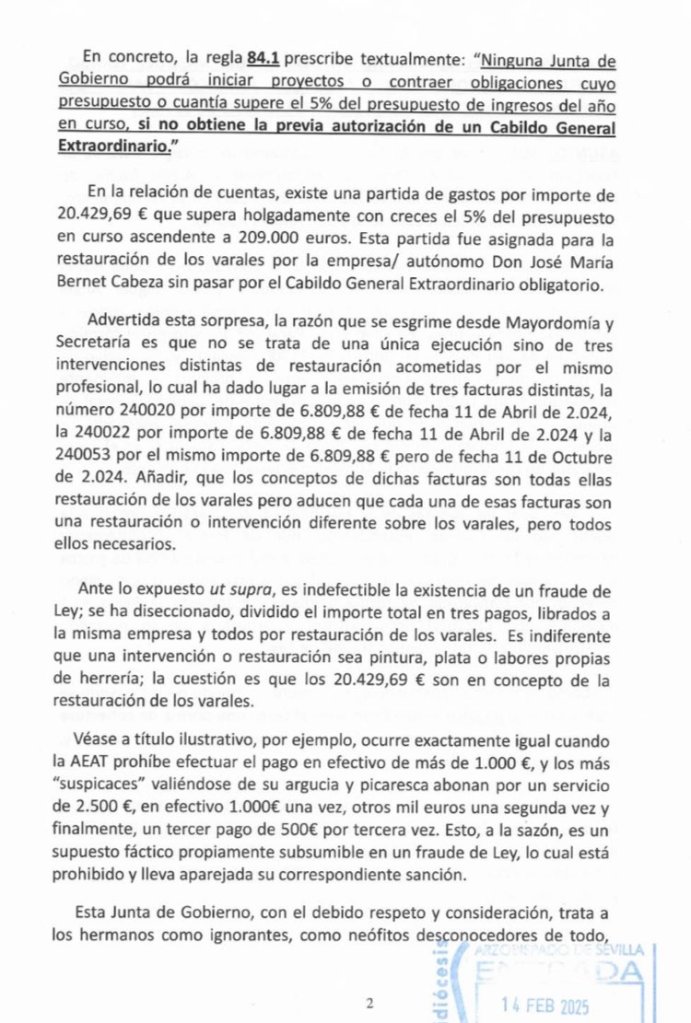 Al parecer, hay una partida de 20.429,69 euros para la restauración de los varales del paso de palio por parte del orfebre José Manuel Bernet, donde superan de manera holgada ese 5% de presupuesto, y sin contar con el obligatorio cabildo de hermanos para llevarse a cabo. Desde la hermandad, según argumentan este grupo de hermanos, el pago se ha fraccionado en tres facturas distintas, de 6.809,88 euros el 11 de abril de 2024, otra factura de la misma cantidad y de la misma fecha, y la última también del mismo importe, pero a fecha del 11 de octubre de 2024.