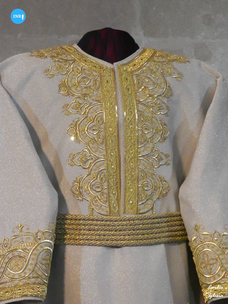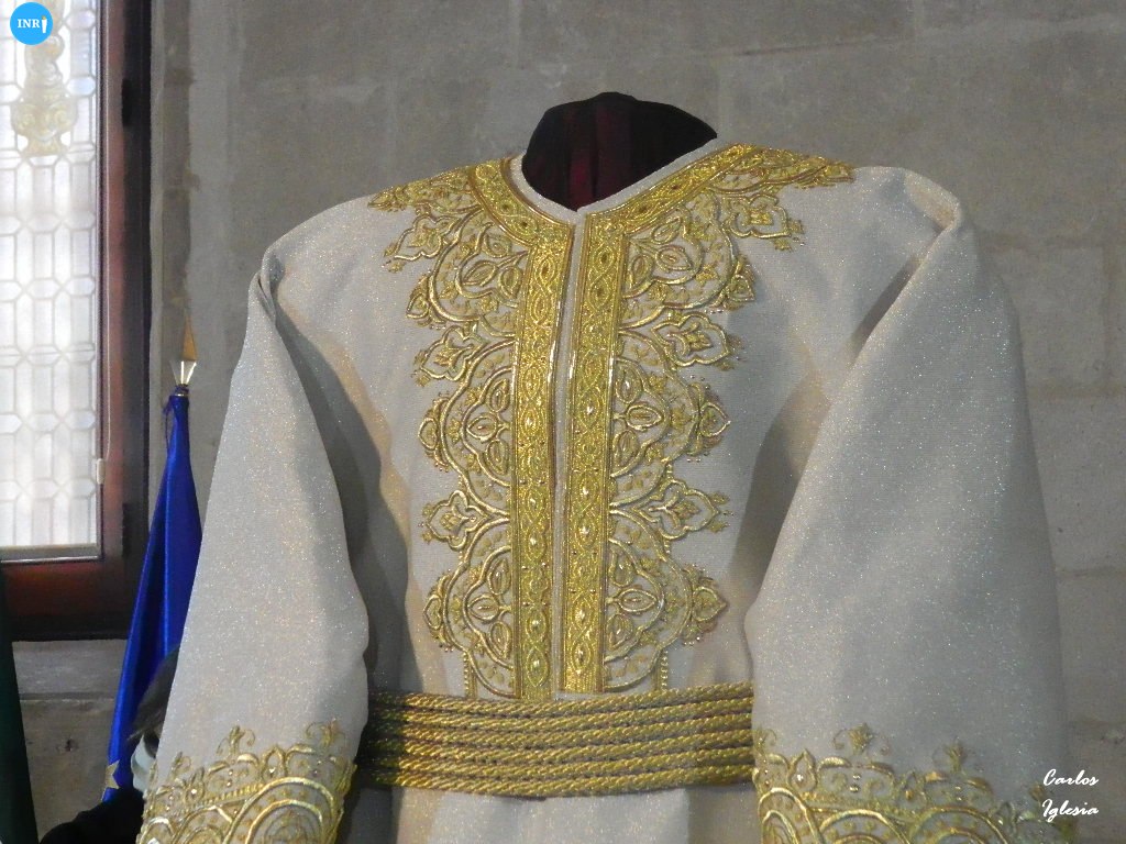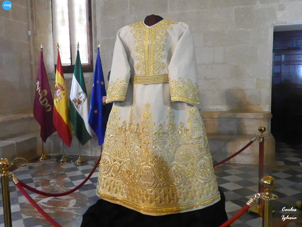 Se trata de una túnica para bordar en oro fino de ley en el mismo tejido que el manto procesional de Nuestra Señora de la Salud, esto es, en tisú blanco. En palabras del diseñador, «su dibujo es muy delicado y lineal, de un estilo oriental, con elementos geométricos, pero mezclando también motivos mudéjares, presidiendo una cenefa de ritmos circulares entrecruzados que alberga cruces y que preside la inscripción ‘EGO SUM CHRISTUS, FILIUS DEI’, aludiendo al momento evangélico representado por la imagen titular».