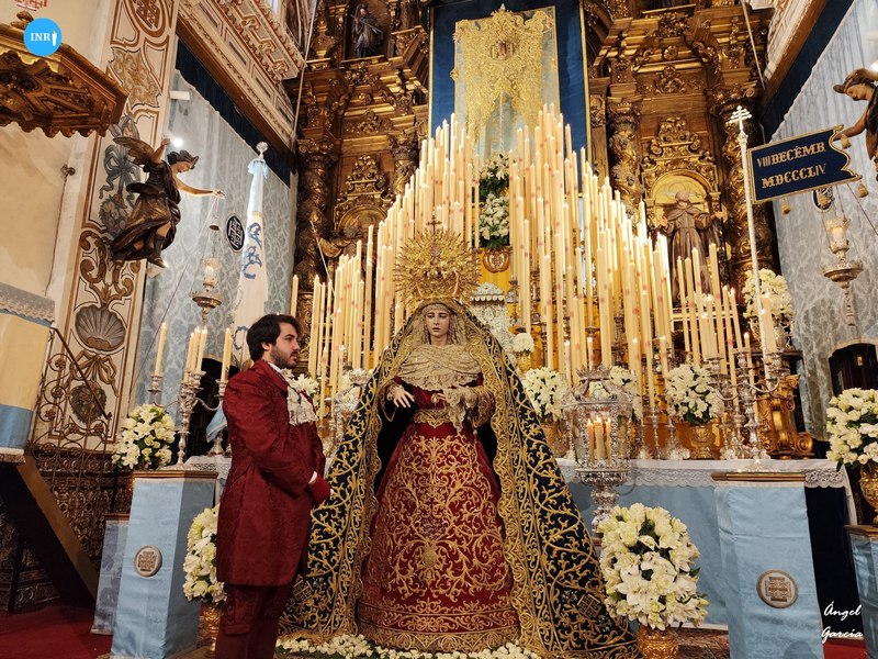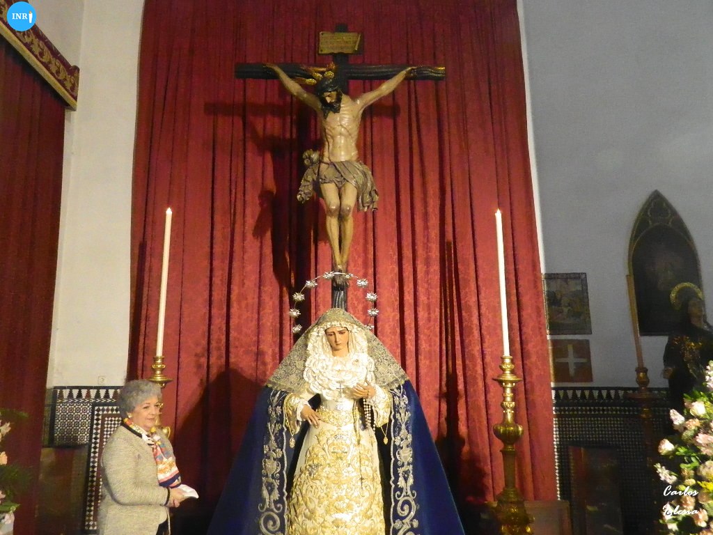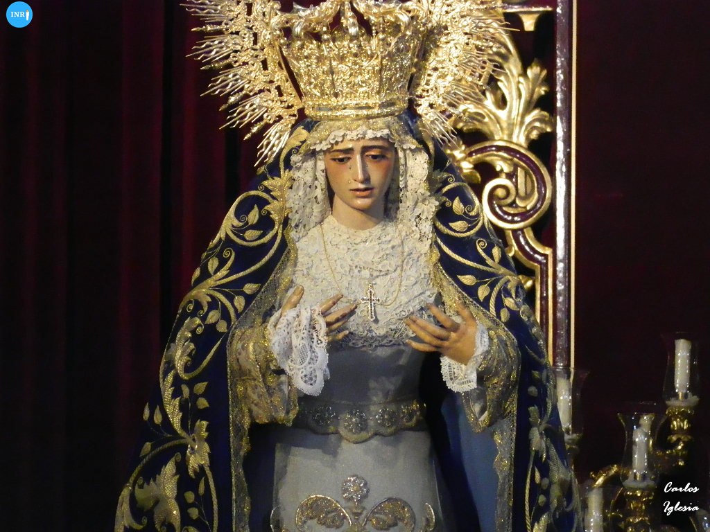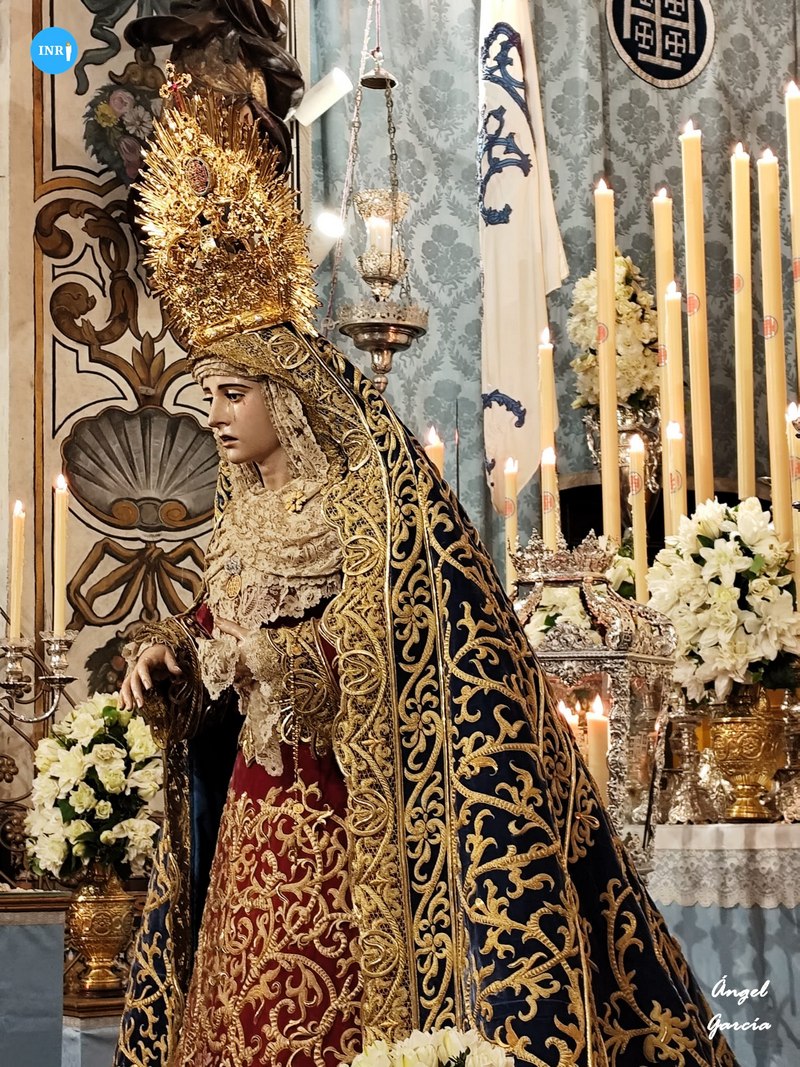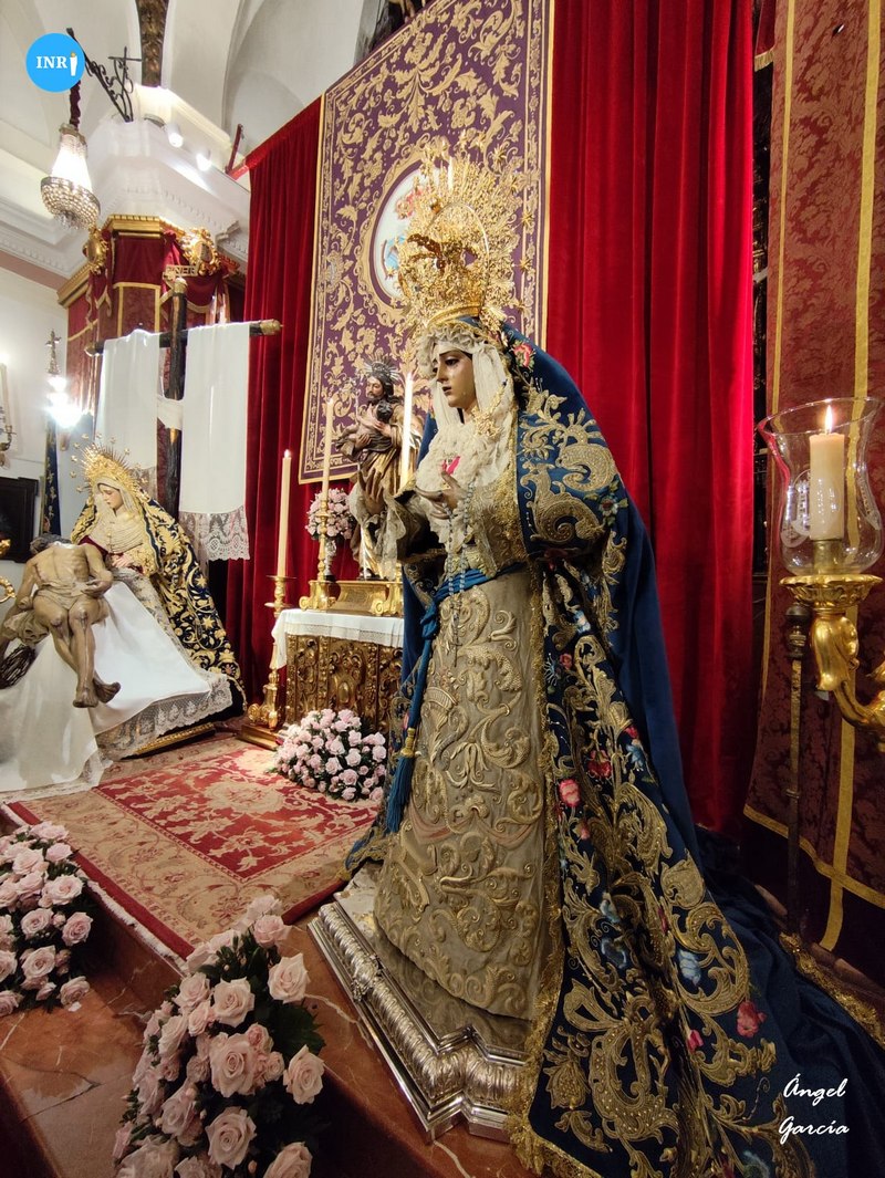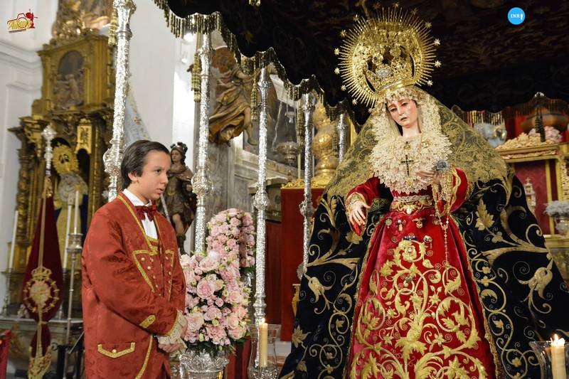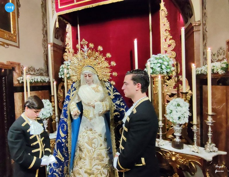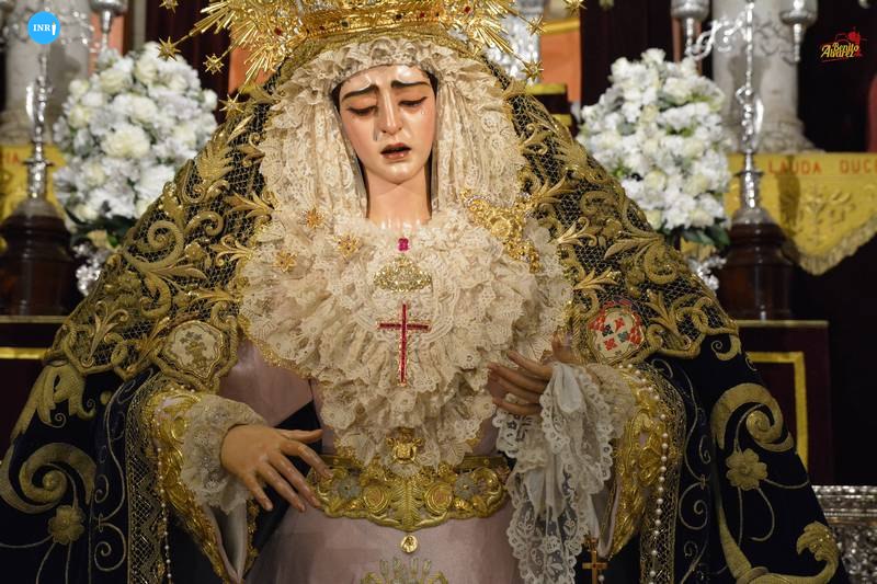 Con su característica solemnidad y elegancia, la dolorosa lució manto azul y saya roja de terciopelo bordada. El altar estuvo presidido por el simpecado de la corporación flanqueado por dos insignias inmaculistas. Con un centro y jarras de nardos y sendos candelabros, además de dos insignias del Dogma de la Inmaculada remató esta puesta.