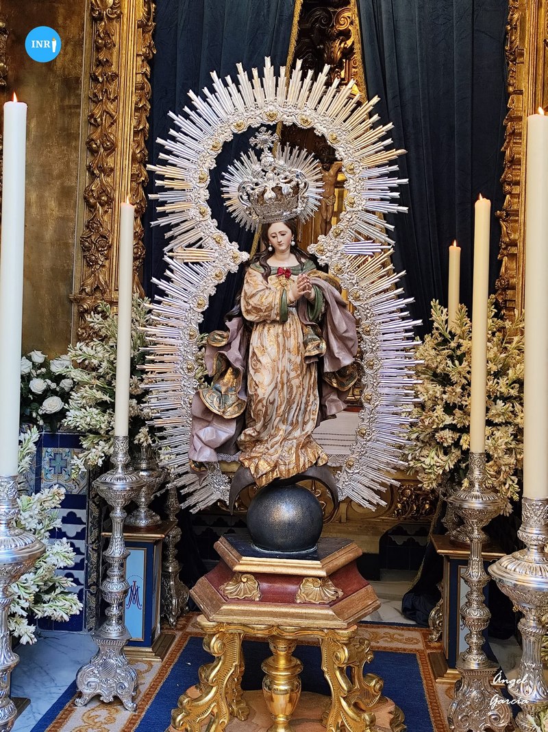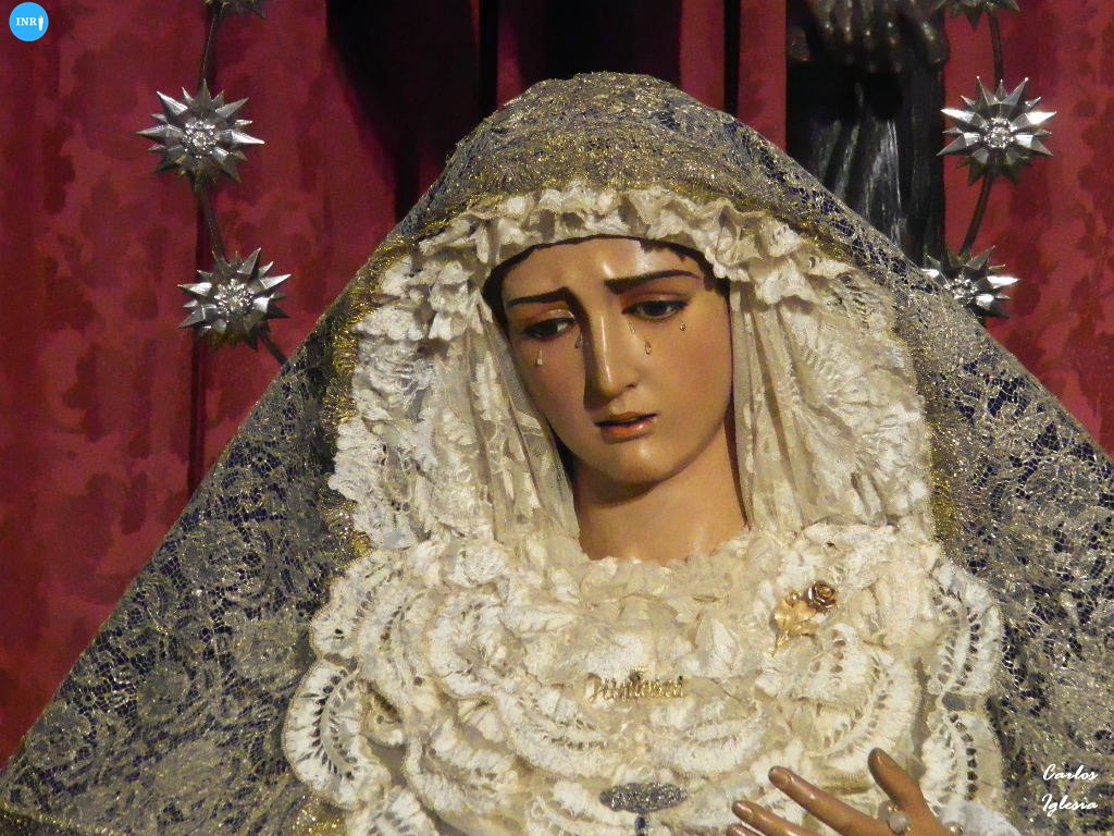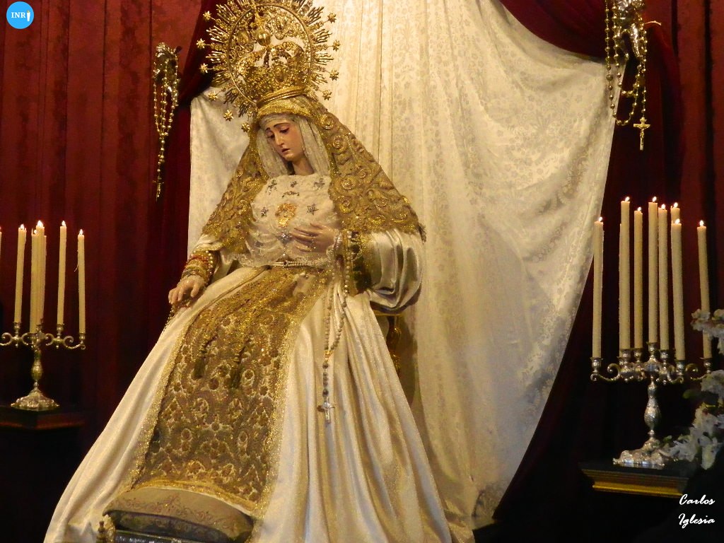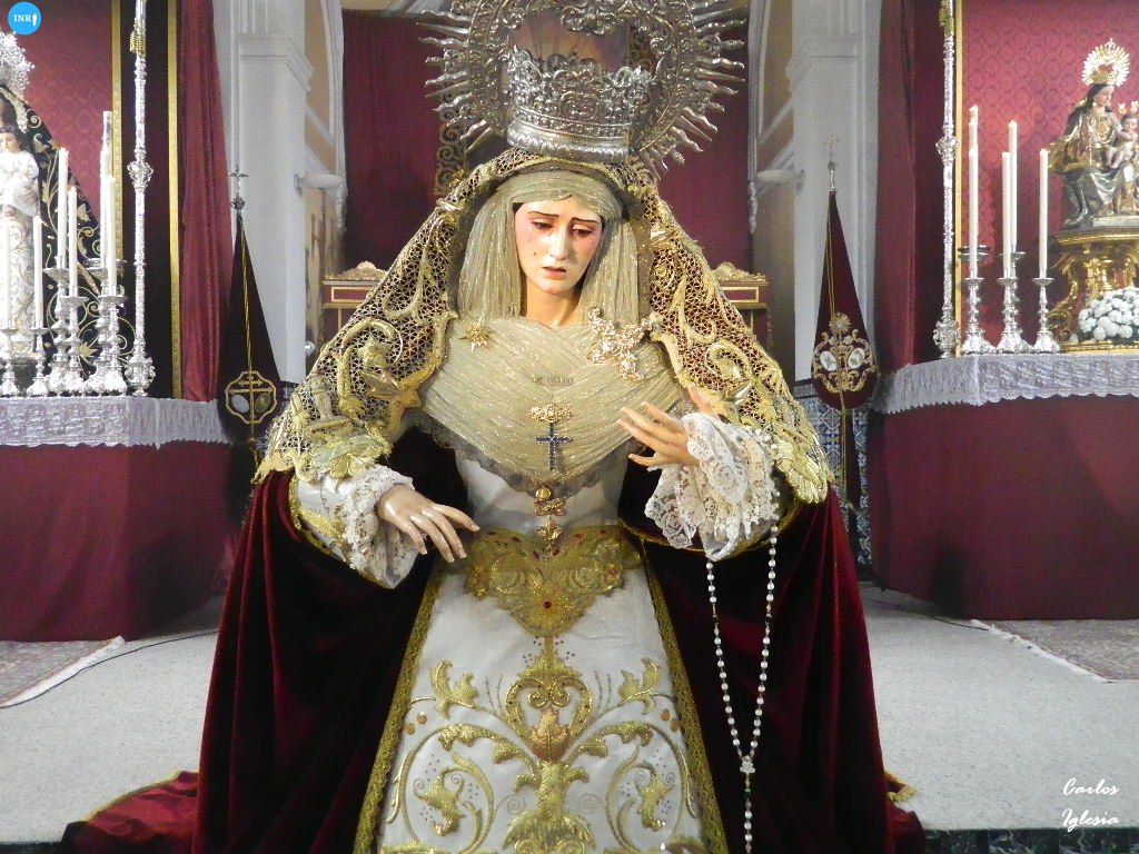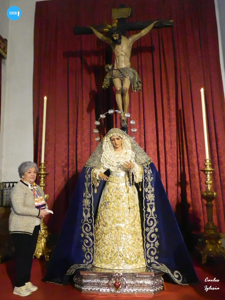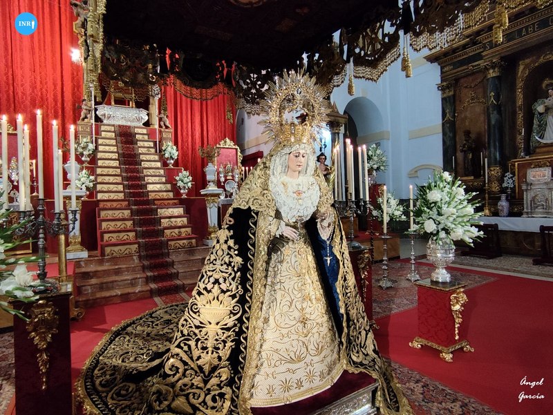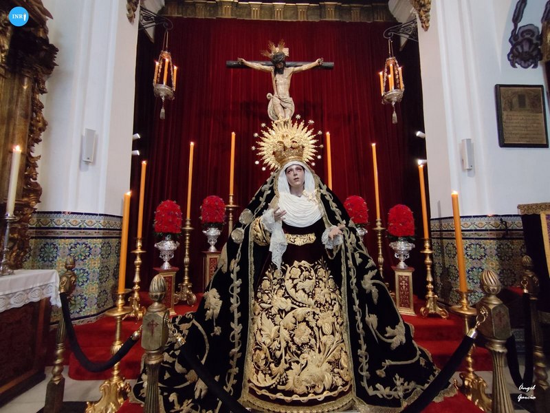 Con su característica solemnidad y elegancia, la dolorosa lució manto azul y saya roja de terciopelo bordada. El altar estuvo presidido por el simpecado de la corporación flanqueado por dos insignias inmaculistas. Con un centro y jarras de nardos y sendos candelabros, además de dos insignias del Dogma de la Inmaculada remató esta puesta.