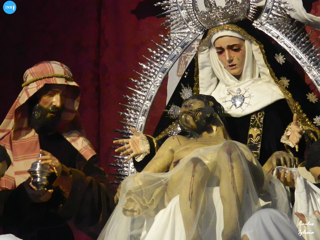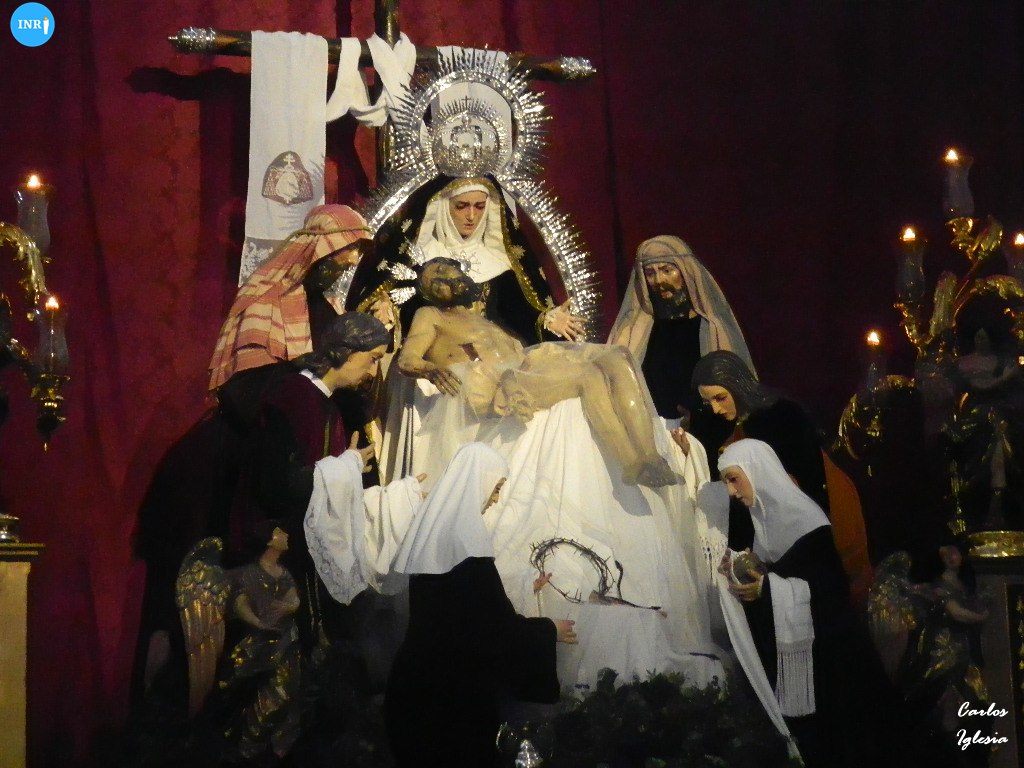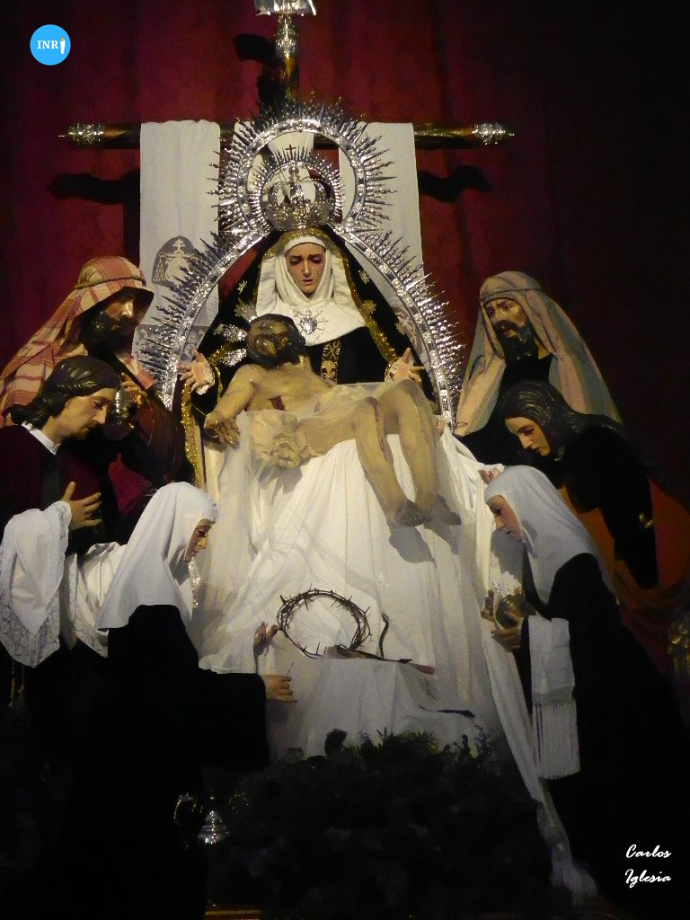 Una estampa de tiempos pretéritos en la Hermandad de la Sagrada Mortaja. La Virgen de la Piedad se presentó con terno negro, ráfaga y tocado monjil, recreando una imagen decimonónica. El Cristo del Sagrado Descendimiento fue dispuesto sobre un velo blanco.