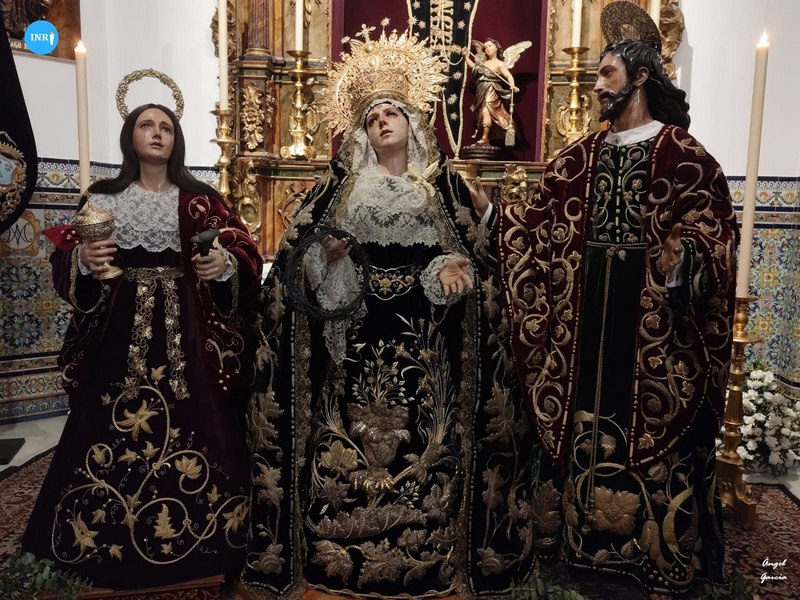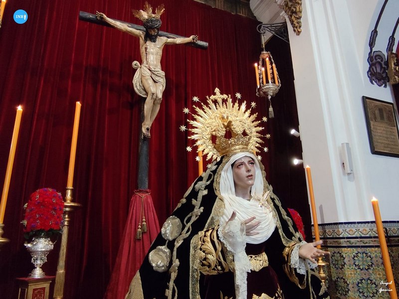 Un altar único en la Hermandad del Cerro. La Virgen de los Dolores lució su manto burdeos de vistas y saya de la misma tonalidad de terciopelo, escoltados por dos ángeles turiferarios.