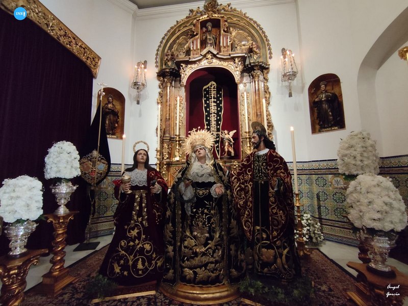 En el altar mayor estuvo los titulares de la Hermandad de la Exaltación, a modo de ‘Stabat Mater’. La Virgen de las Lágrimas, con manto azul bordado y saya blanca se situó a los pies del Cristo de la Exaltación.