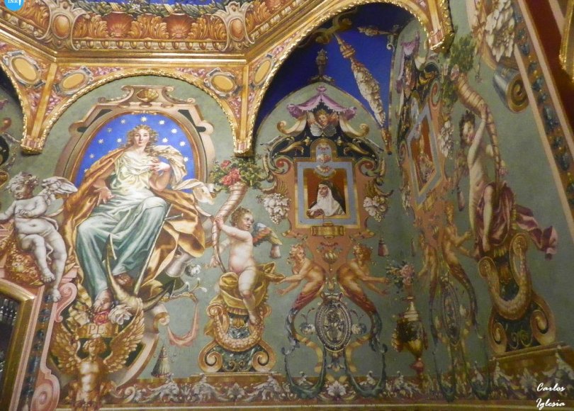 En las pinturas del antecamarín, destaca su estilo palaciego, donde culminan con una imponente bóveda de un cielo azul lapislázuli estrellado. Es una auténtica ‘catequesis visual’ que engloba las cuatro padres de la sala.