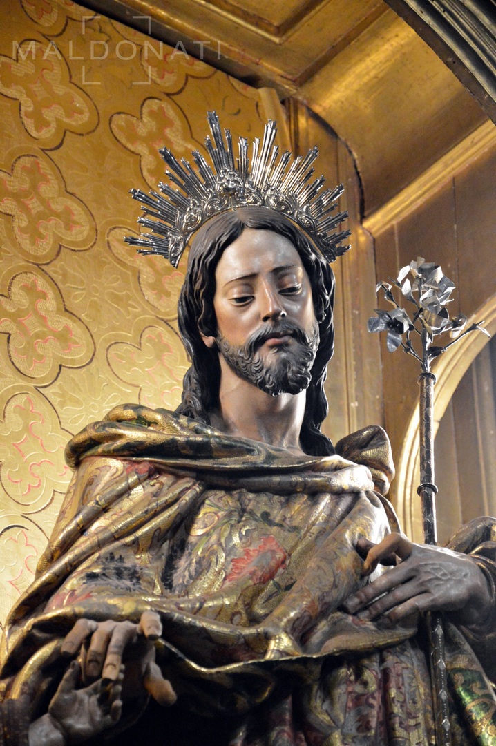 La imagen que apreciamos debe ser, con casi toda seguridad, anterior al retablo en cuyo lugar está situado. Hablamos del altar mayor de la iglesia que fue concertado con el ensamblador Jerónimo Velázquez en 1630. Aquí vemos a San José llevando al Niño Jesús de la mano. La iconografía de este santo, en la primera mitad del siglo XVIII, aparece el Niño caminando de la mano de San José mientras que en la segunda parte es más común verlo cogido en brazos.