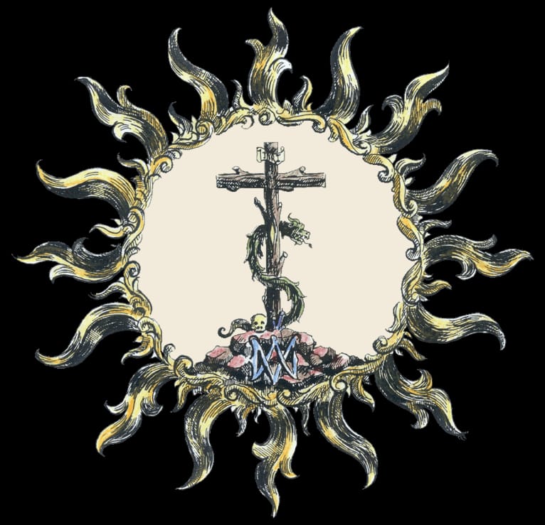 En el stipes de la cruz se enrosca, se enrosca, herida, la serpiente del pecado toda en su color. Sobre el monte se colocará el anagrama en plata de María por ser la primera redimida.