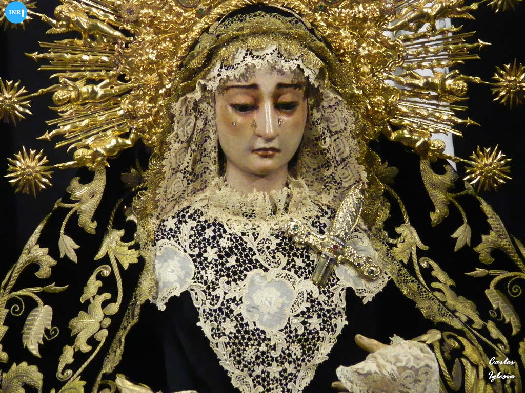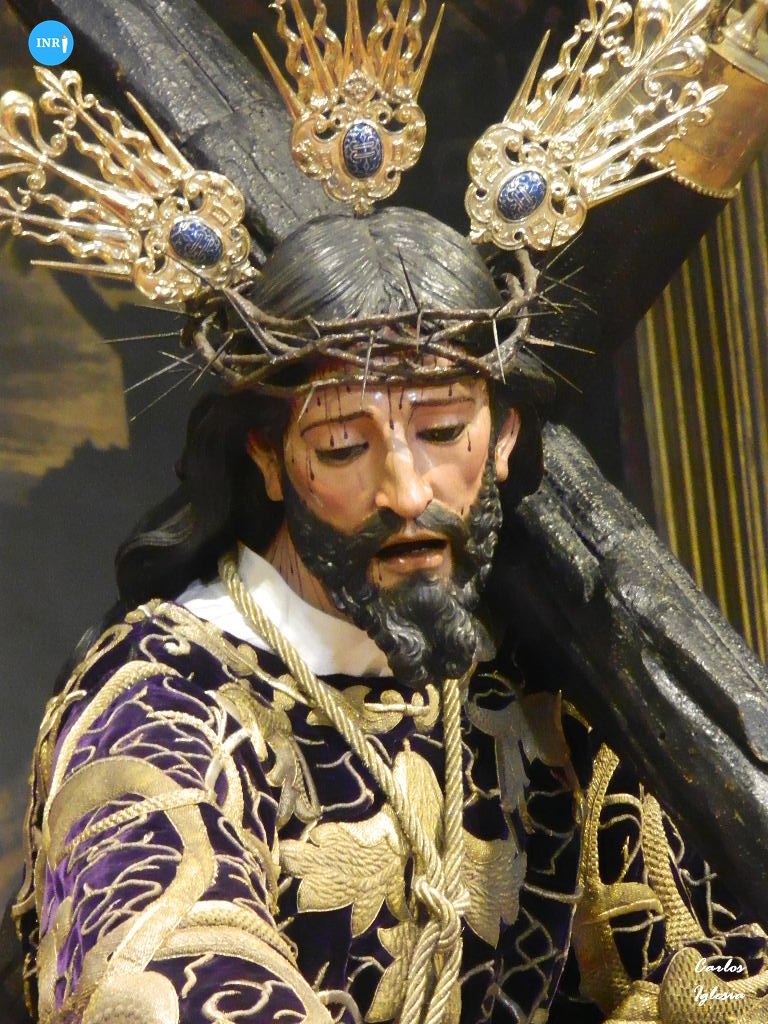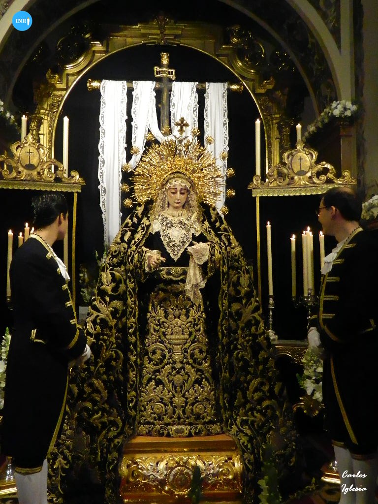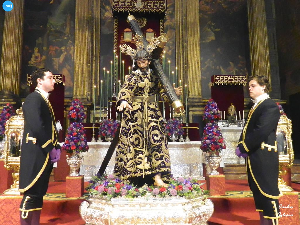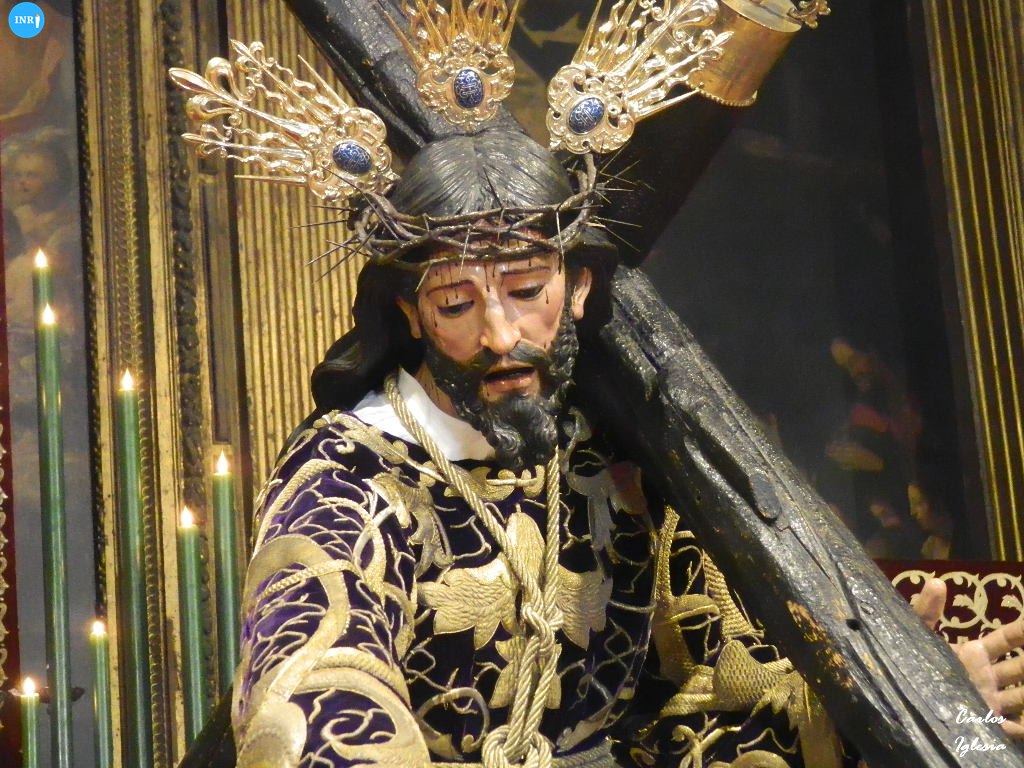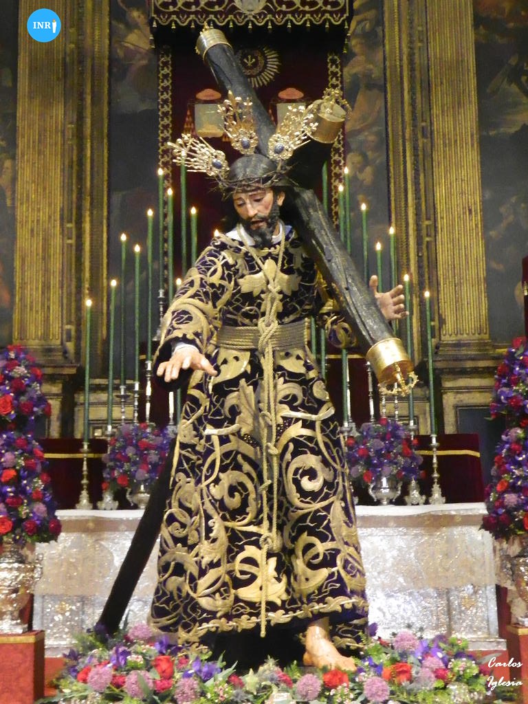 Se abrieron las puertas de la ‘catedral de Triana’ que da al coro para la salida del cortejo, compuesto por la cruz y los ciriales antecediendo a la imagen. Llevó para la ocasión una túnica bordada en terciopelo burdeos y su cruz arbórea con casquillos dorados