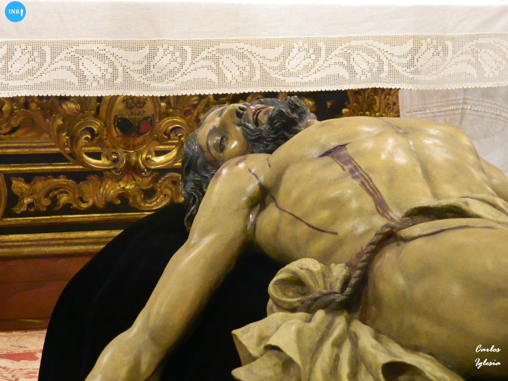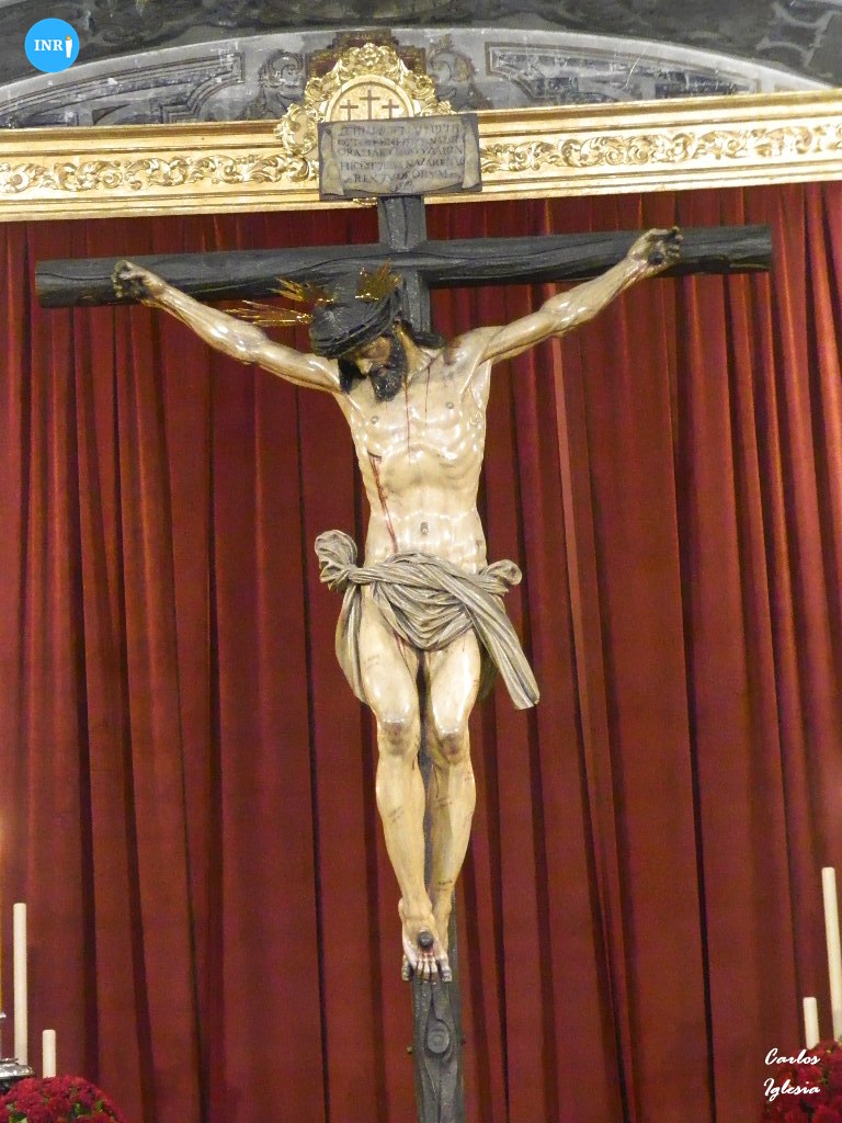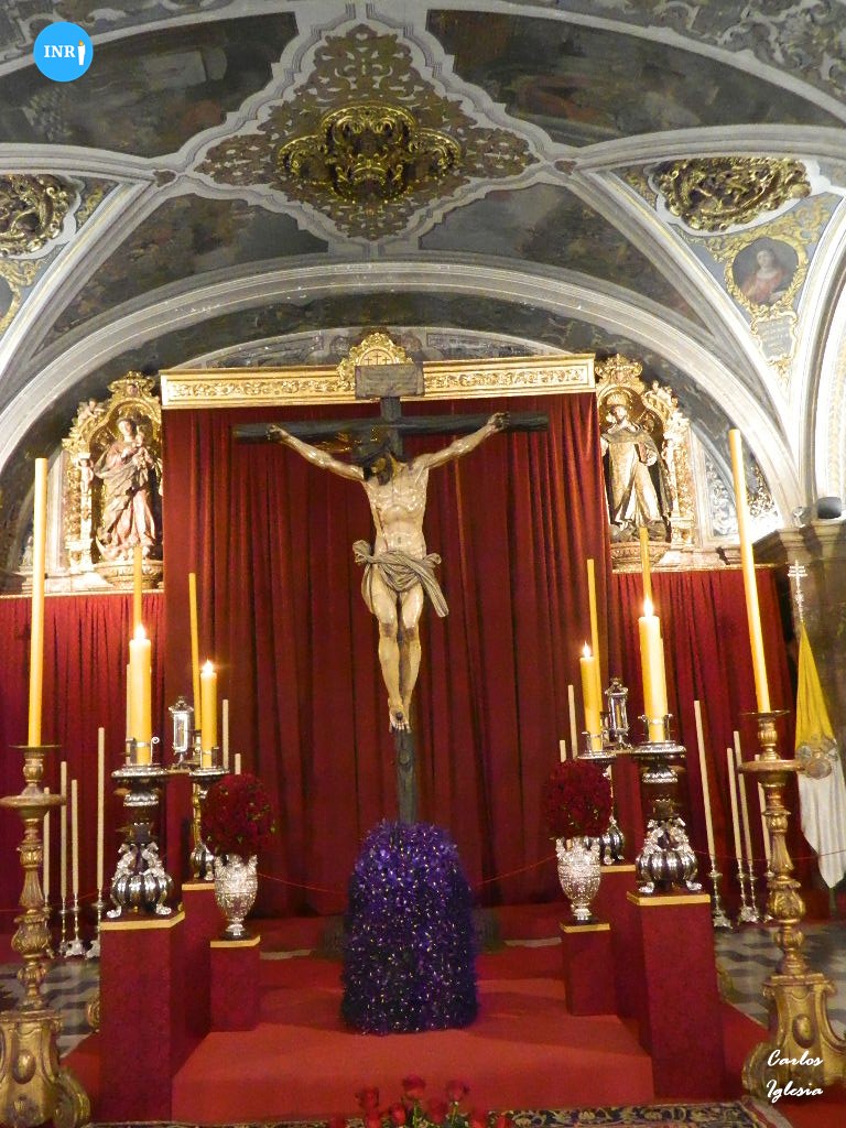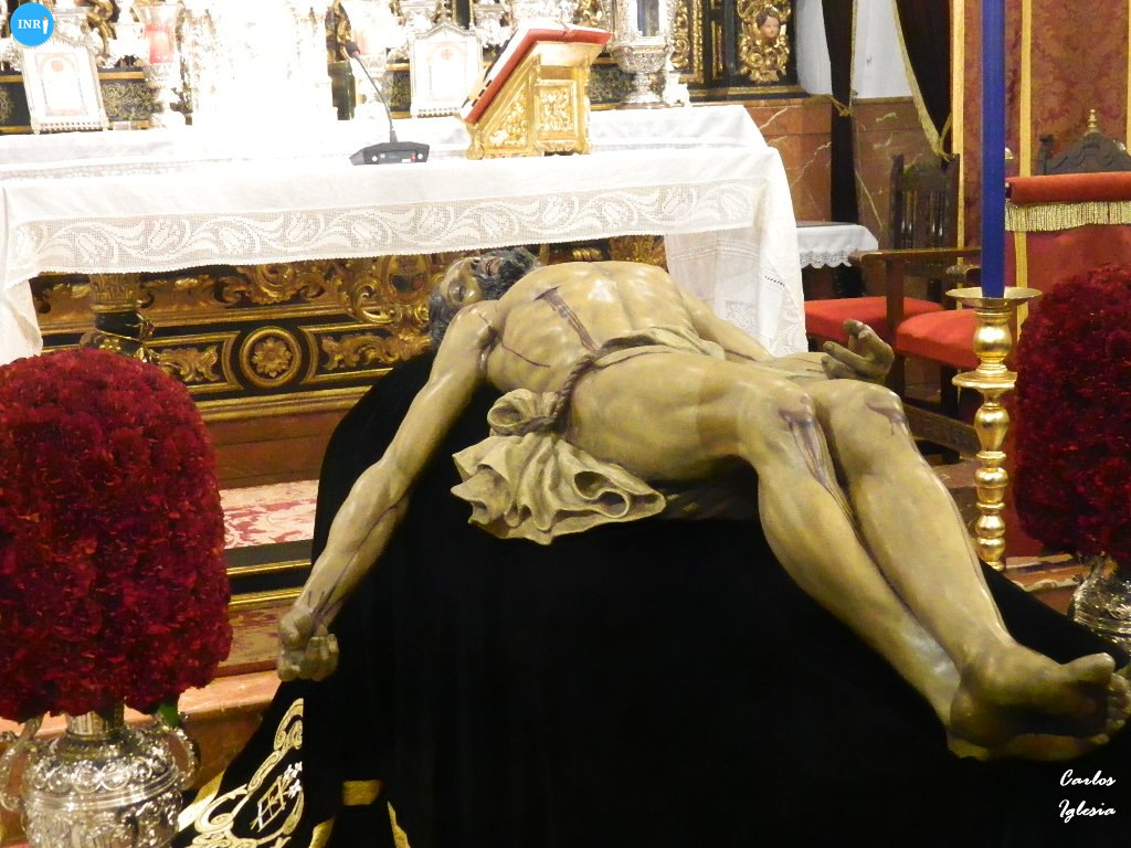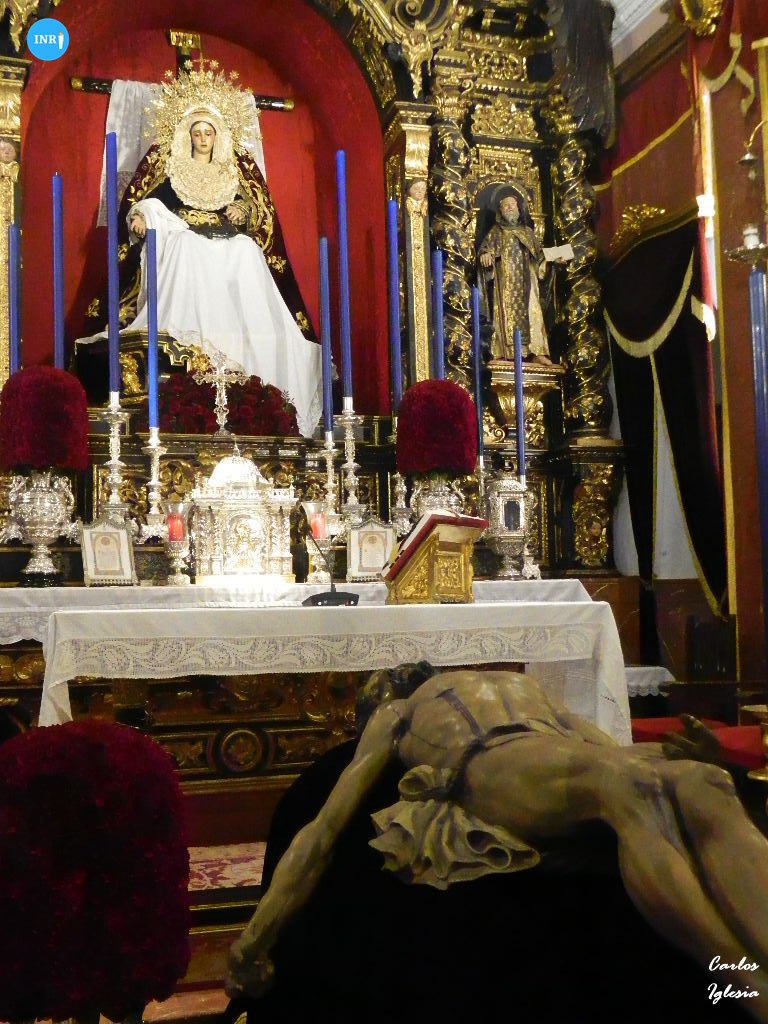 A la luz de la candelería de cera azul se encontraba el Cristo de la Misericordia en su besapiés, a los pies del altar que presidía la Virgen de la Piedad. Clavel rojo como exorno en el inicio de los cultos para el titular cristífero de la Hermandad del Baratillo.
