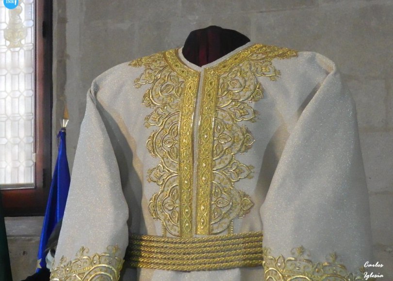 Se trata de una túnica para bordar en oro fino de ley en el mismo tejido que el manto procesional de Nuestra Señora de la Salud, esto es, en tisú blanco. En palabras del diseñador, «su dibujo es muy delicado y lineal, de un estilo oriental, con elementos geométricos, pero mezclando también motivos mudéjares, presidiendo una cenefa de ritmos circulares entrecruzados que alberga cruces y que preside la inscripción ‘EGO SUM CHRISTUS, FILIUS DEI’, aludiendo al momento evangélico representado por la imagen titular».