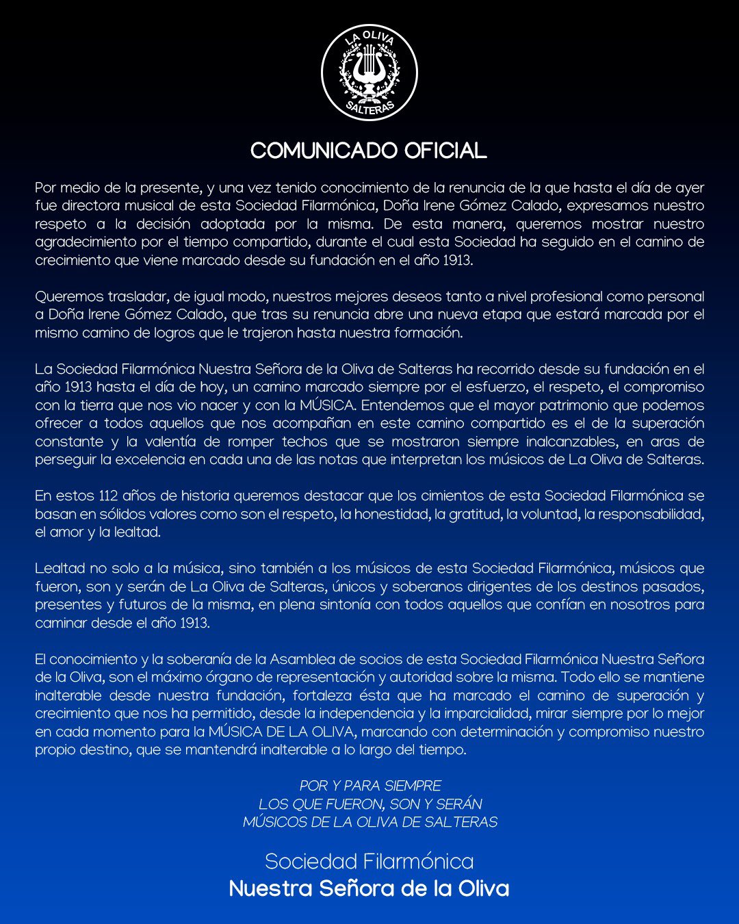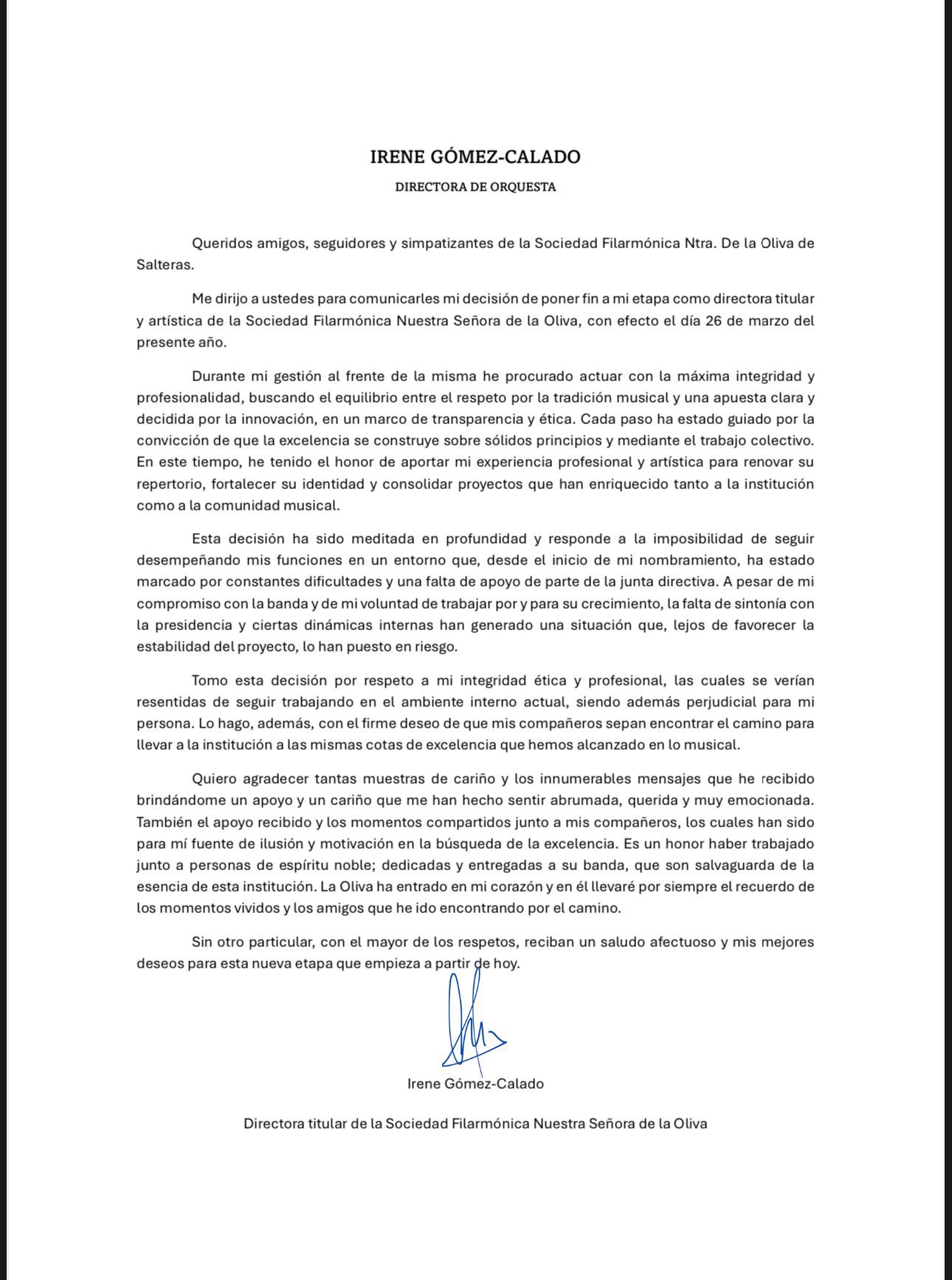 A poco más de dos de semanas del comienzo de la Semana Santa, se ha conocido que Irene Gómez-Calado renuncia a su cargo como directora de la Sociedad Filarmónica de la Oliva de Salteras. Cabe recordar que llevaba ostentando el cargo desde diciembre de 2022.