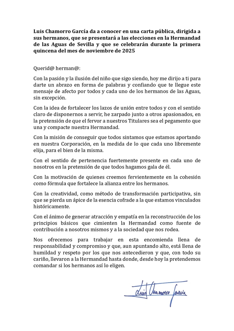 Considera que la hermandad «es un vínculo que nos une, y con esa idea clara y el propósito firme de servir, emprendo este camino acompañado de otros apasionados, convencidos de que el fervor a nuestros titulares debe ser el lazo que nos fortalezca y nos haga crecer juntos».
