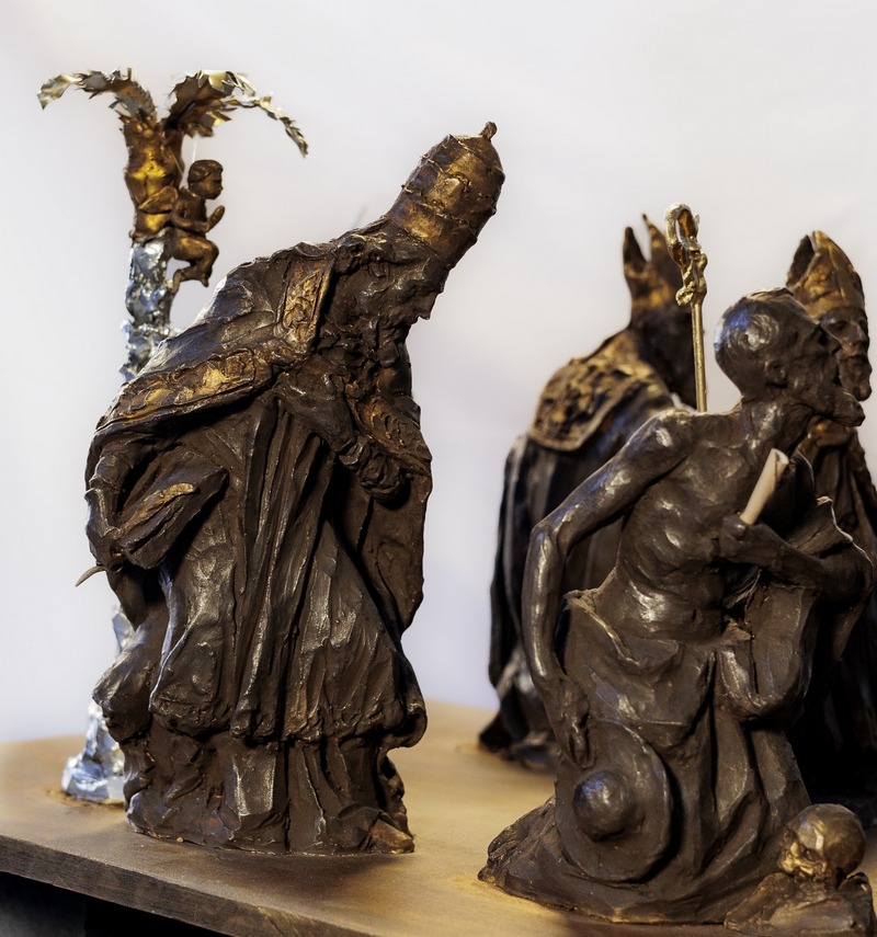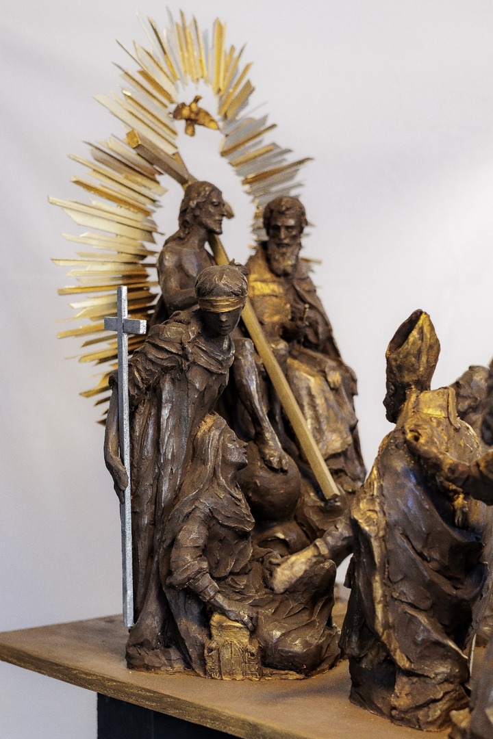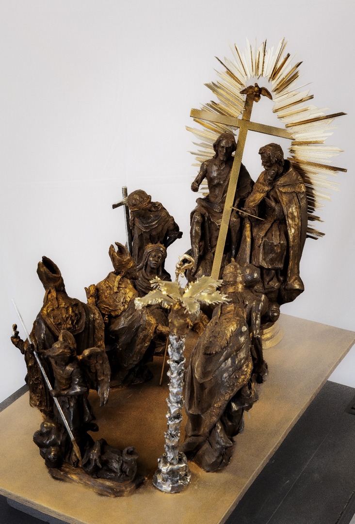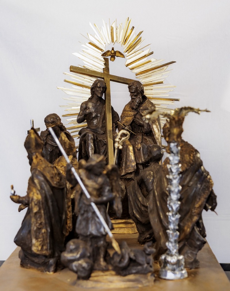 Tras un estudio detallado del informe teológico elaborado por la comisión, el imaginero ha diseñado una propuesta en la que la Santísima Trinidad adquiere un protagonismo más claro mediante su elevación dentro del conjunto, realzada por una ráfaga de rayos que otorga mayor majestuosidad a la escena.