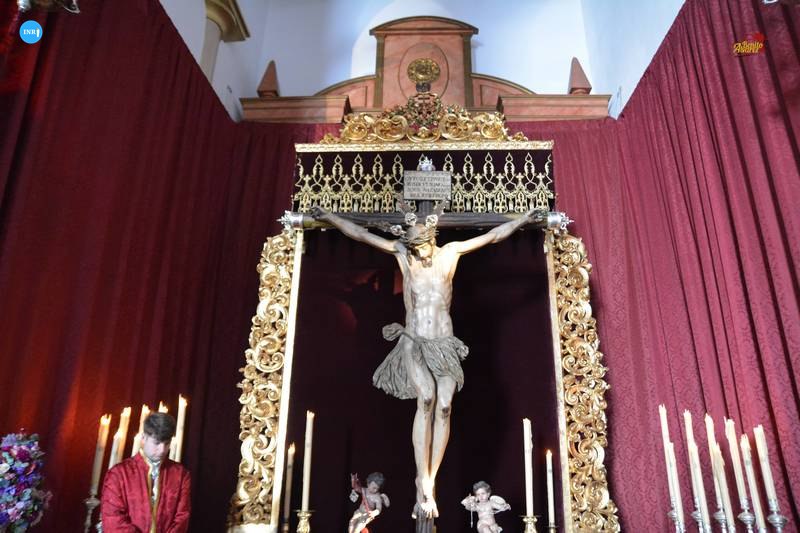 El Cristo del Desamparo y Abandono de la Hermandad del Cerro recibió a sus fieles en besapiés. Bajo dosel estuvo la imagen con jarras de flores y candeleros de cera blanca para este culto interno que tuvo lugar en ese fin de semana.