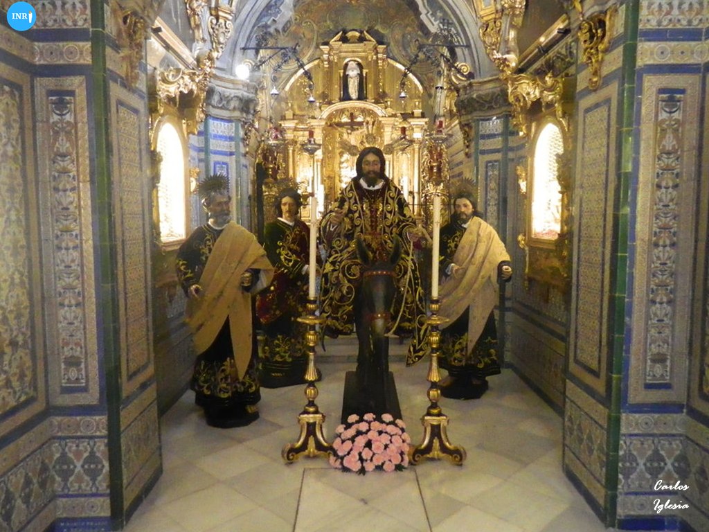 Una estampa única se pudo ver unos días en la iglesia colegial del Salvador. El Señor de la Sagrada Entrada en Jerusalén de la Hermandad del Amor estuvo en la capilla de los Desamparados de cara a la función y besapiés, junto con San Juan Evangelista, Santiago y San Pedro.