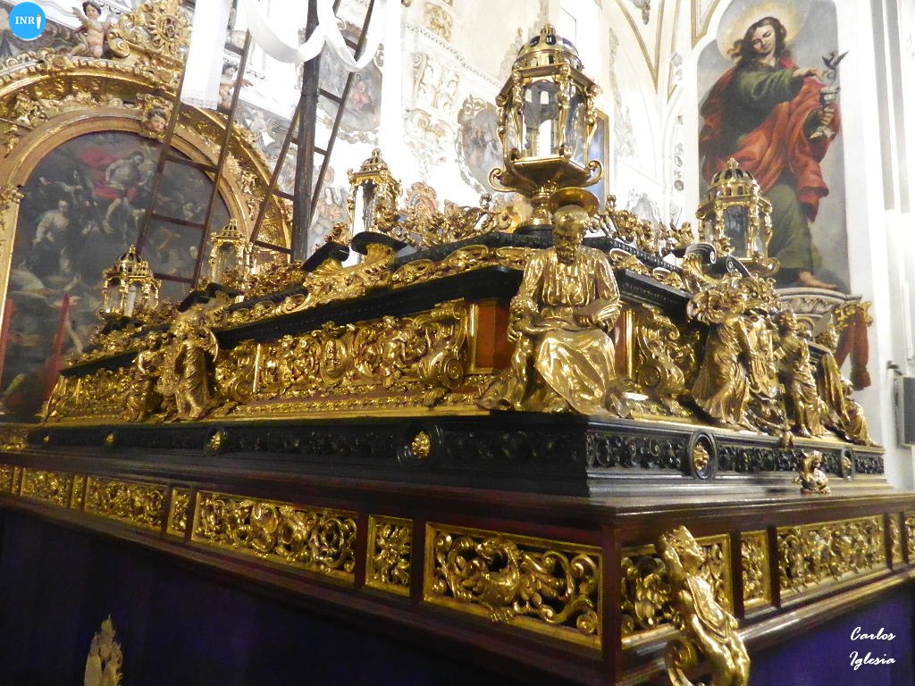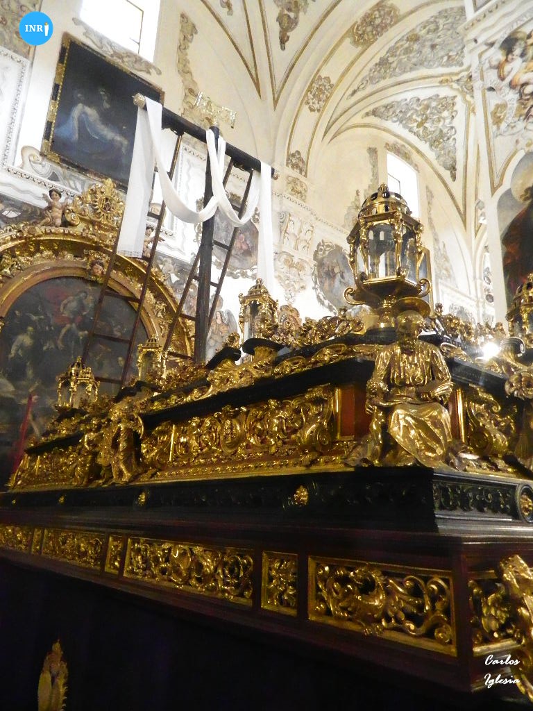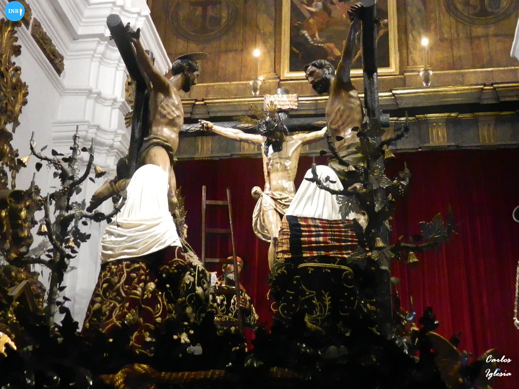 En la real parroquia de la Magdalena ya se encuentra el paso de misterio de la Quinta Angustia. Los titulares se subirán a su paso una vez finalice el besamanos y besapiés en su honor del Jueves de Pasión y Viernes de Dolores.