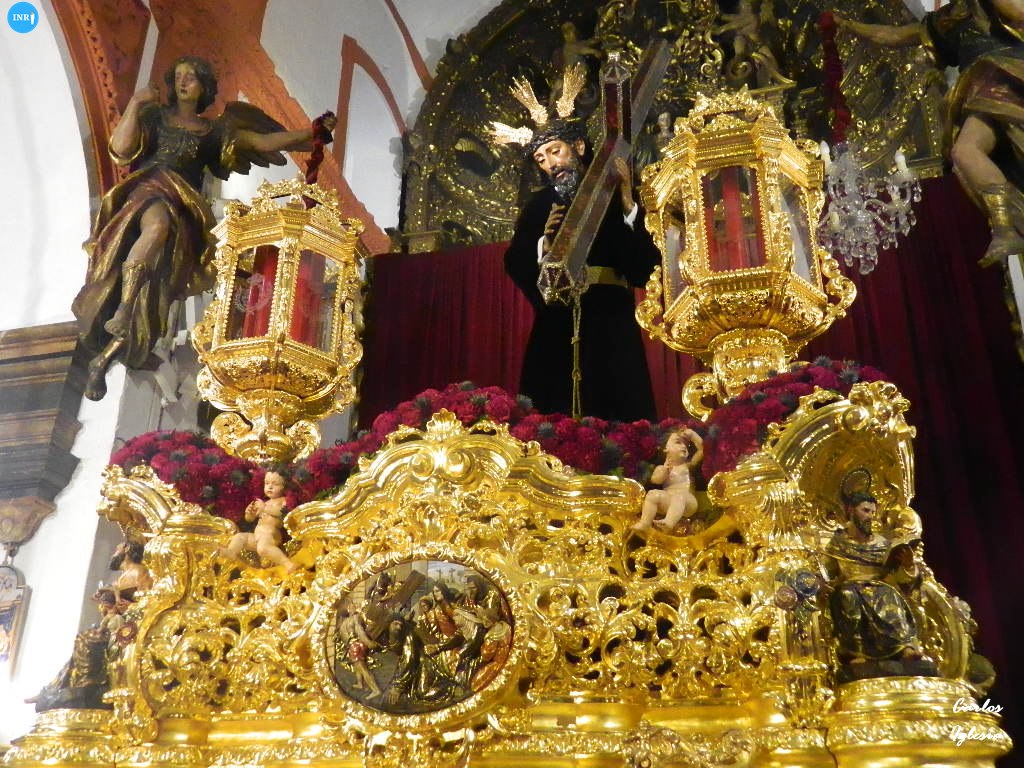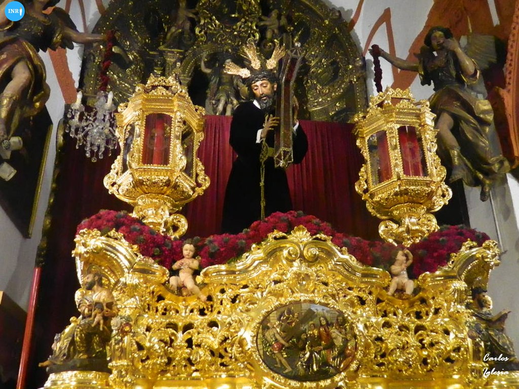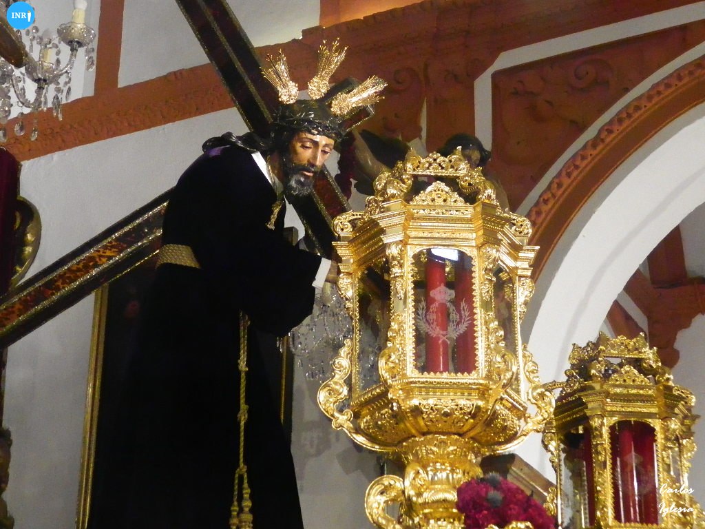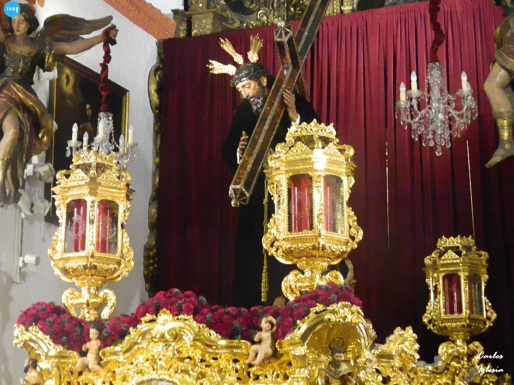 La imagen de Jesús Nazareno de la Hermandad de la O ya está en su paso procesional, portando su cruz de carey. Lleva túnica de terciopelo.