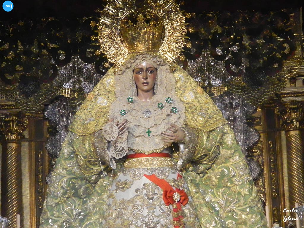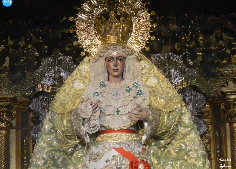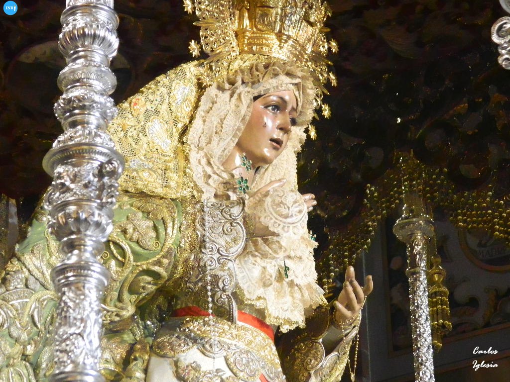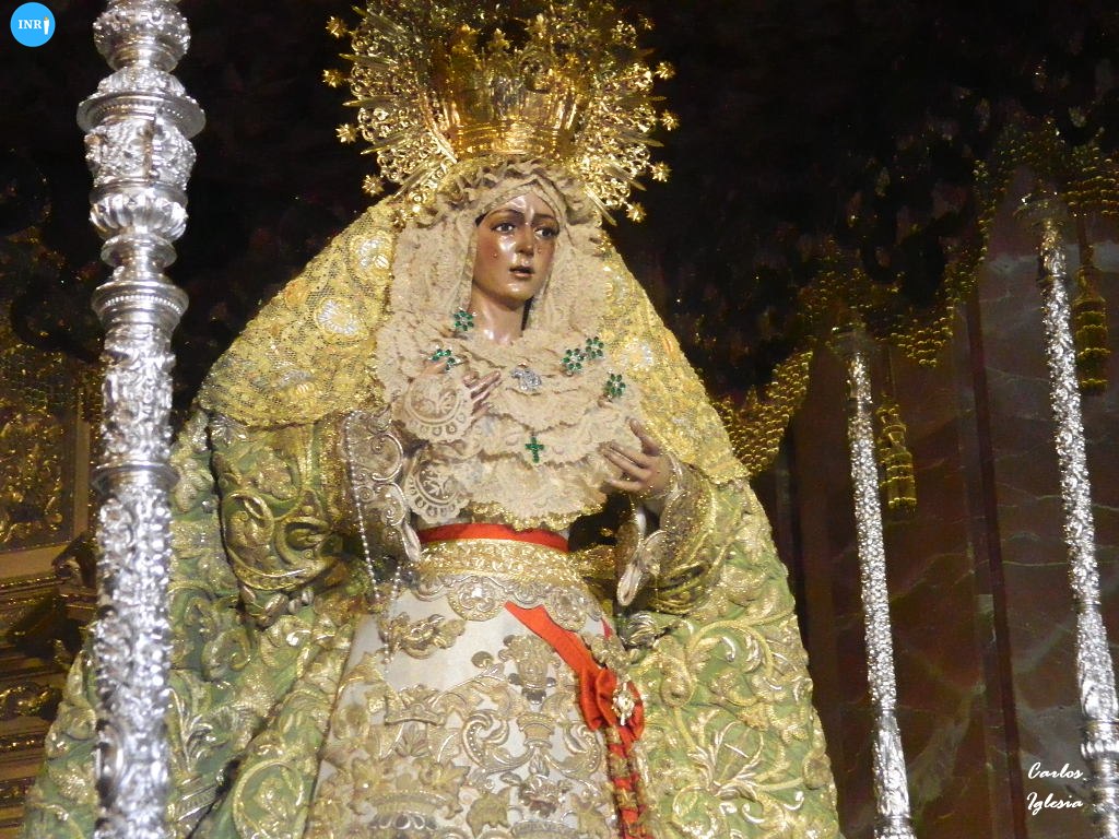 La Virgen de la Esperanza luce el manto de tisú, obra de Juan Manuel Rodríguez Ojeda, de 1930 y la saya de los volantes de 1936.