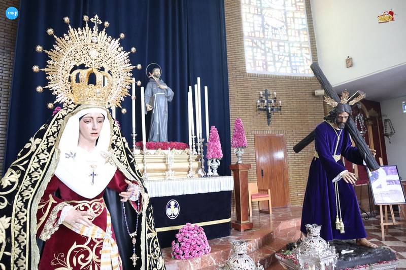 Los titulares de la Hermandad del Divino Perdón de Alcosa estuvieron expuestos en besamanos extraordinario de manera conjunta. El Señor del Divino Perdón llevó túnica morada, mientras que la Virgen de la Purísima Concepción lo hizo con manto azul y saya burdeos a juego.